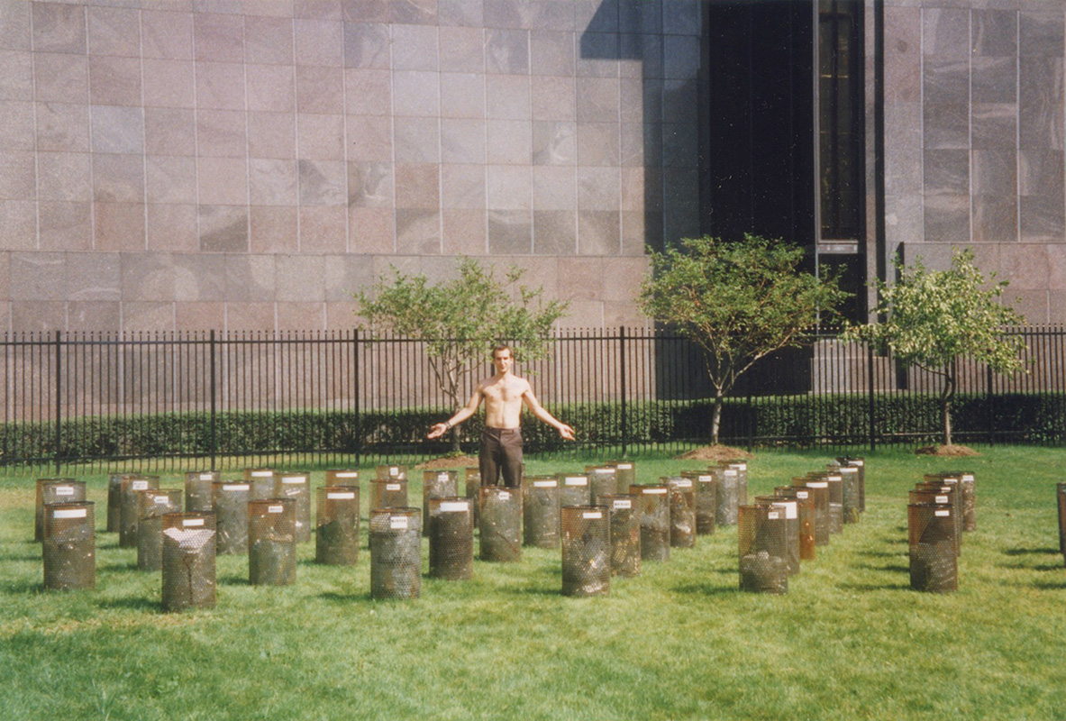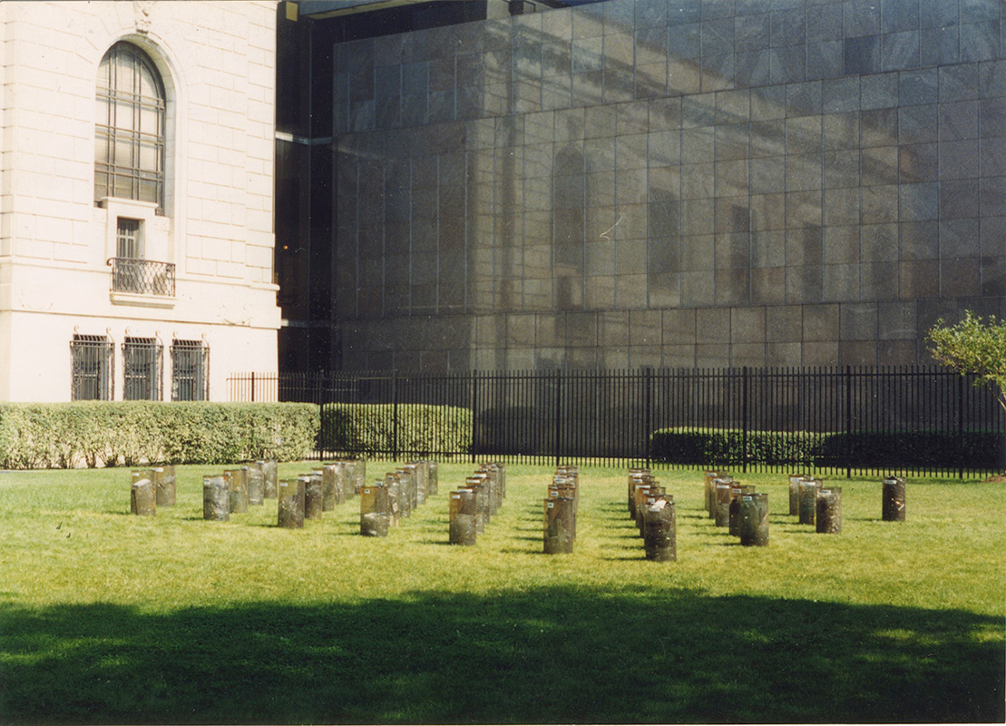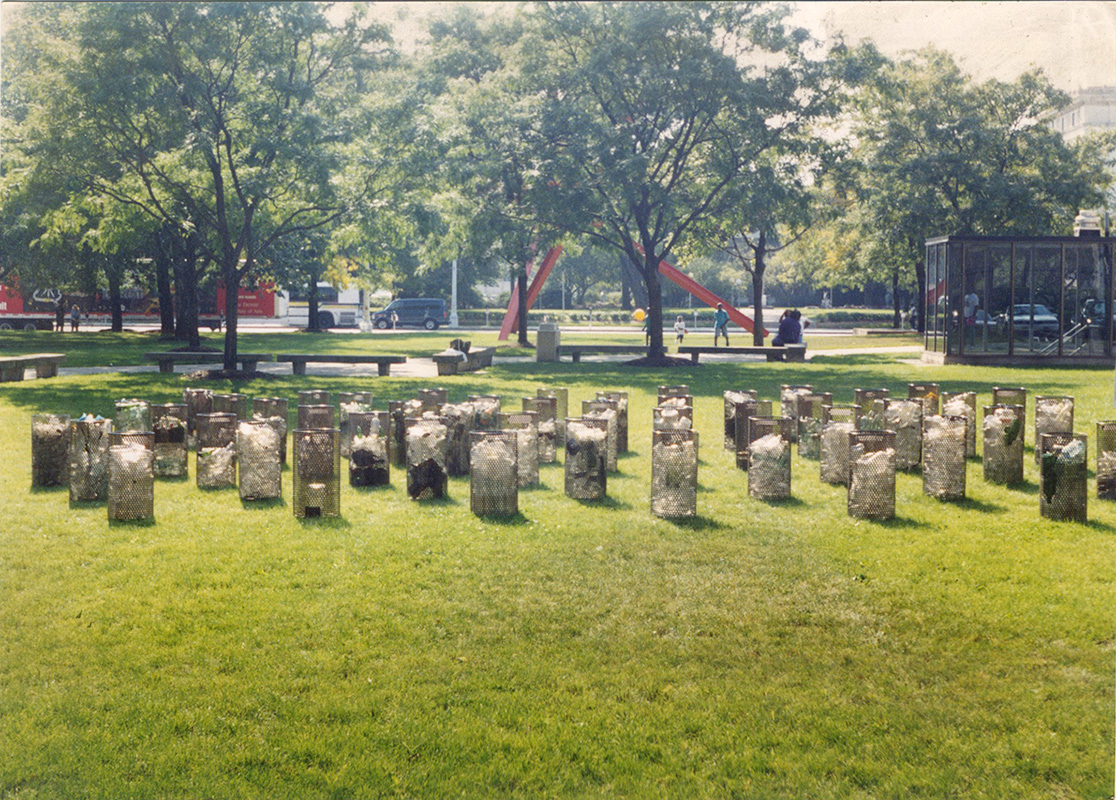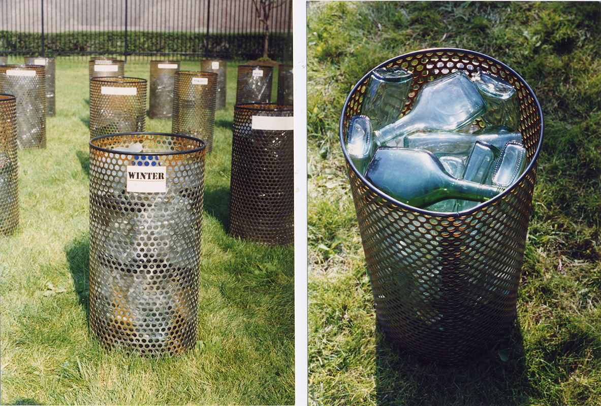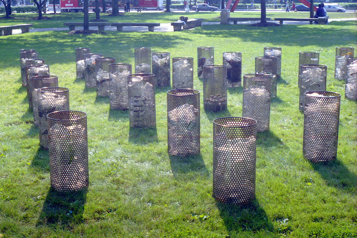2,222 was a site-specific installation created and installed on the DIA lawn for the Art On The Move artist residency / mentorship in 1998. I created 49 cylinders filled with thousands of empty liquor bottles gathered from around my neighborhood in Detroit. I had no car back then and walked everywhere, pushing shopping carts to gather materials, just like the scrappers. As part of the program, I worked with / mentored 6 Detroit high school students, who helped me arrange and secure the bottles, while I collected and cleaned them. The cylinders were labeled with dates, names, and stories chronicling my experiences collecting empties. It was a filthy project, like so many of my projects since then, but some of the experiences were tiny epiphanies that have affected me ever since - it’s crazy to read my diary-like labels now and see how I wrote / thought back then. It was an early project and I feel embarrassed by the craftsmanship and my 23-yr-old writing, but I still love how the light danced through the glass, and reading all the labels brings me right back to 1990s Detroit... The work sat on the DIA grounds during the former Detroit Festival of Arts, until I eventually hauled it all back to CCS, where I recycled all 2,222 of the bottles, and left the cylinders wasting away between bldgs. At some point the school got sick of my growing trash heap - I lived in my studio at the college by then, and had nowhere to store anything - so they got rid of them all. But I managed to save one little guy, who’s still rusting away on my studio patio 2 decades later.