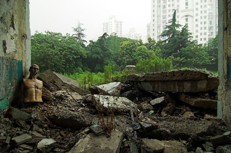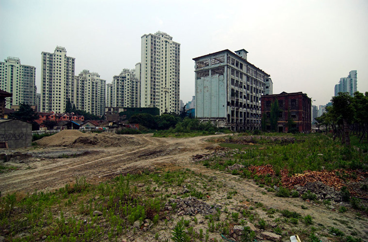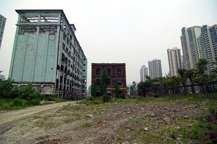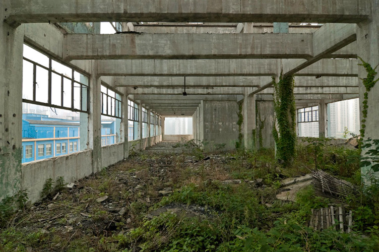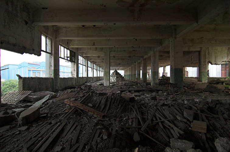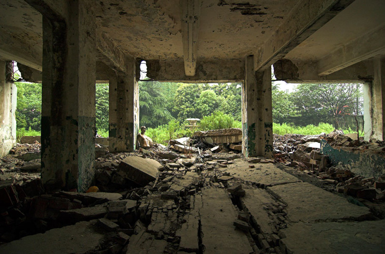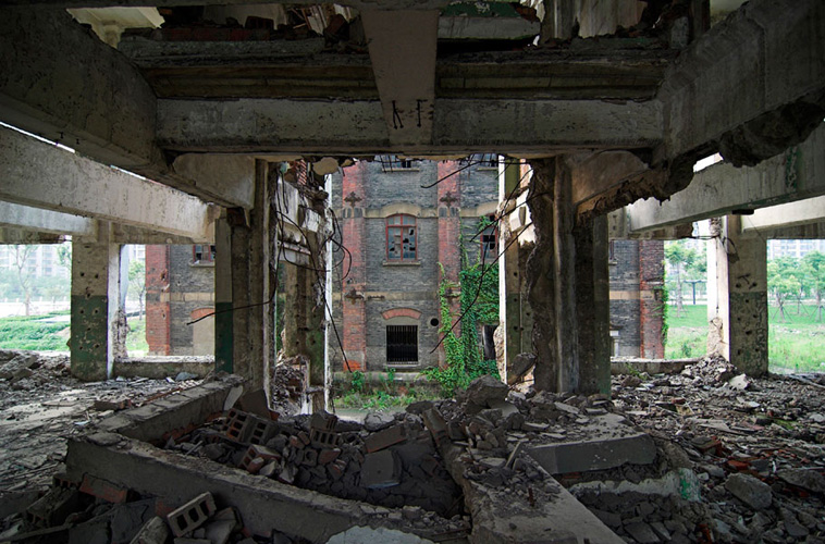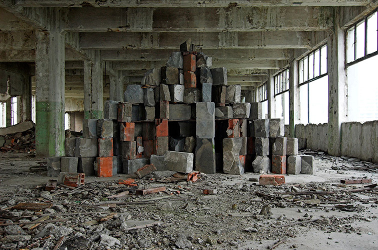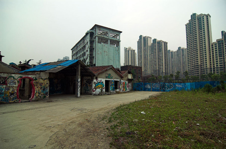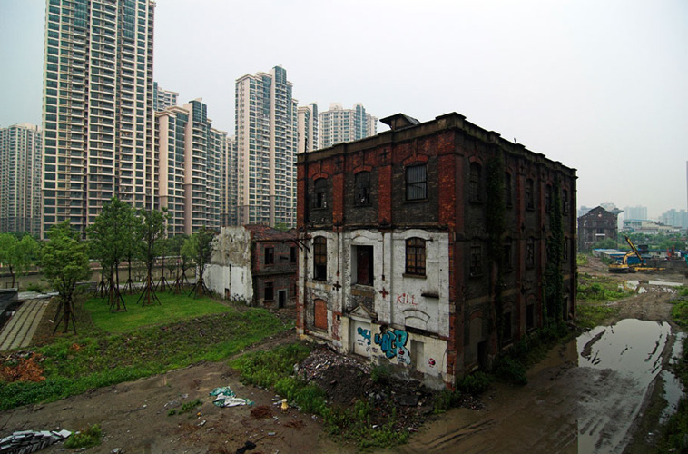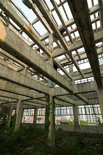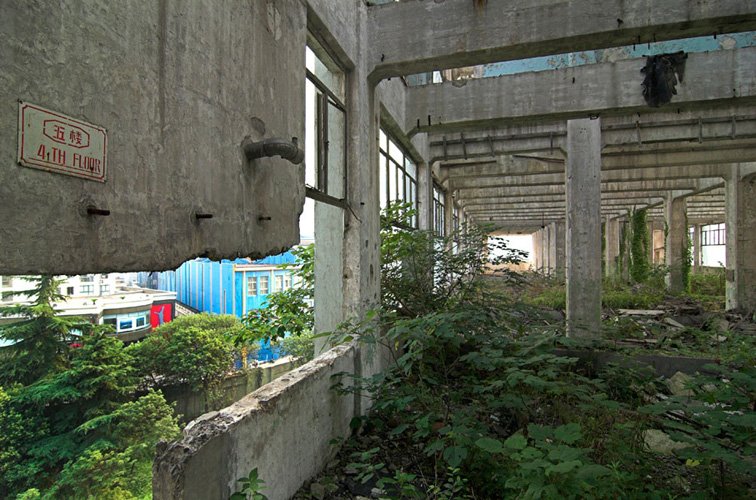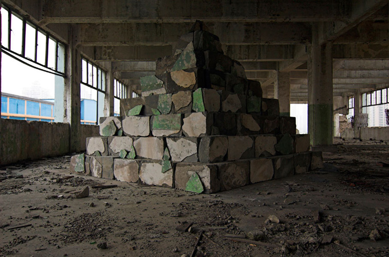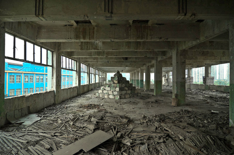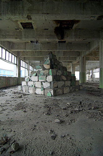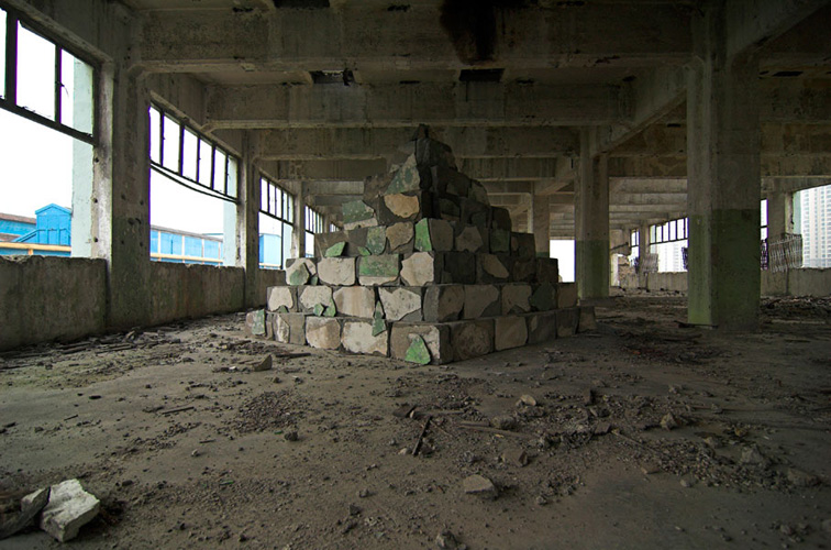 LAO ZHU AND THE FLOUR FACTORY is a photo project within the abandoned flour factory buildings near Suzhou Creek in Shanghai, China. The area was redeveloped into a park along the creek, with 3 smaller brick buildings being saved, and one large concrete structure slated for demolition. With much help from Steve Harris of M97 Gallery, I was given permission to work there by the neighborhood gatekeeper, and former flour factory employee, Lao Zhu. After documenting the site, I built the pyramid and hut during the last 2 days of my stay in Shanghai. The building was torn down only 1 week later. |