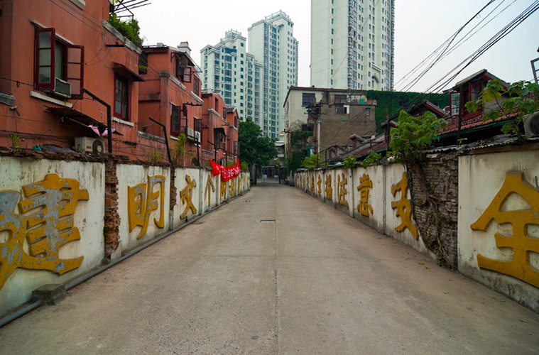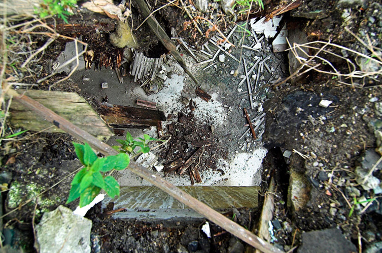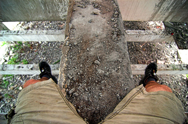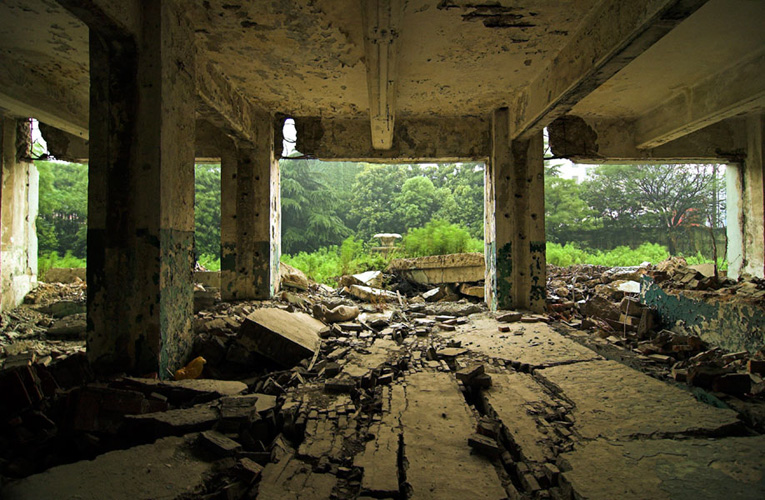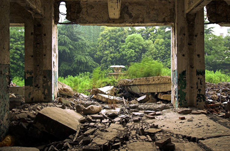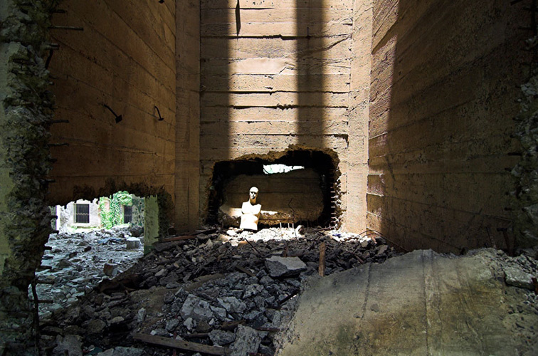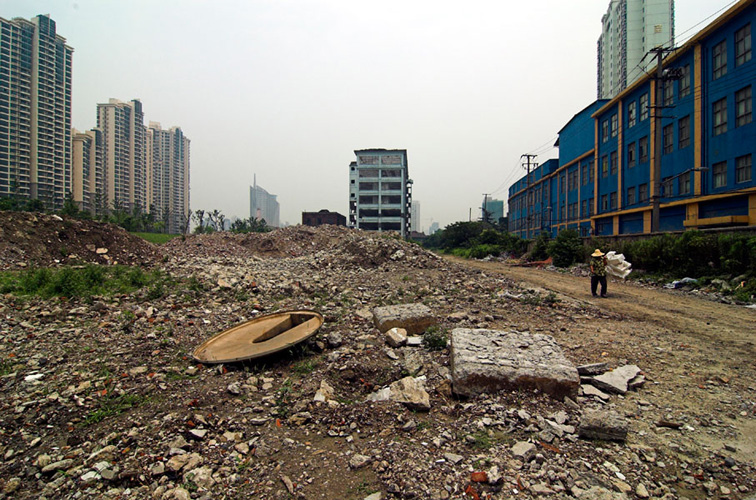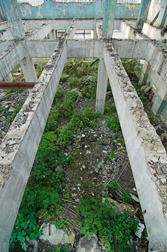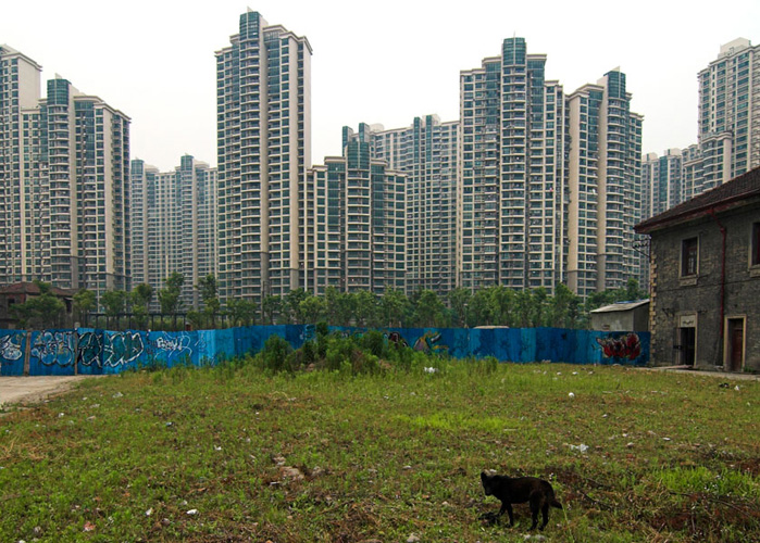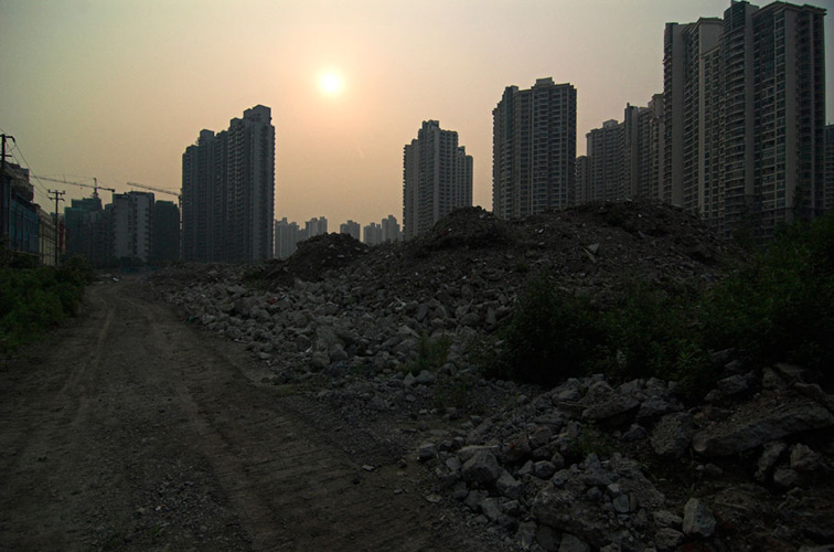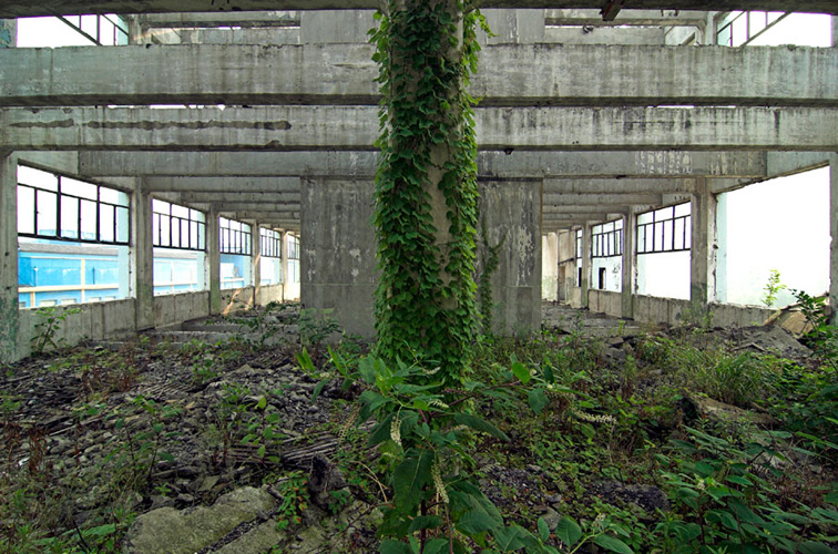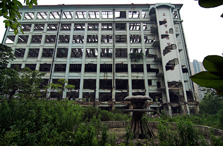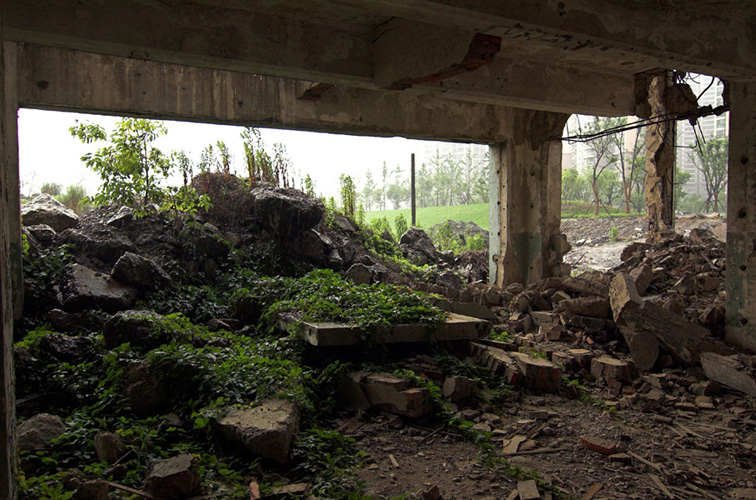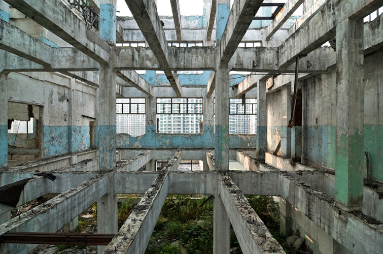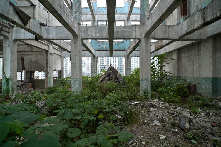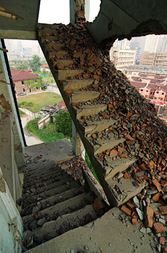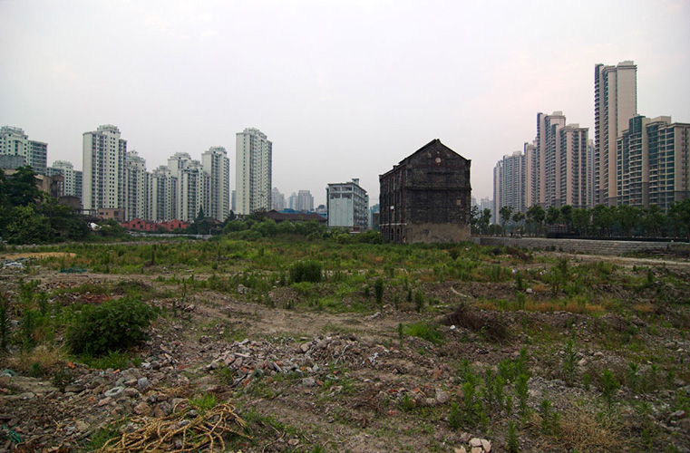 LAO ZHU AND THE FLOUR FACTORY is a photo project within the abandoned flour factory buildings near Suzhou Creek in Shanghai, China. The area was redeveloped into a park along the creek, with 3 smaller brick buildings being saved, and one large concrete structure slated for demolition. With much help from Steve Harris of M97 Gallery, I was given permission to work there by the neighborhood gatekeeper, and former flour factory employee, Lao Zhu. After documenting the site, I built the pyramid and hut during the last 2 days of my stay in Shanghai. The building was torn down only 1 week later. |