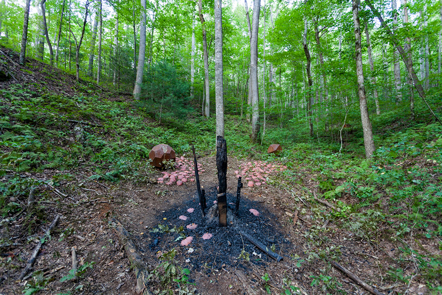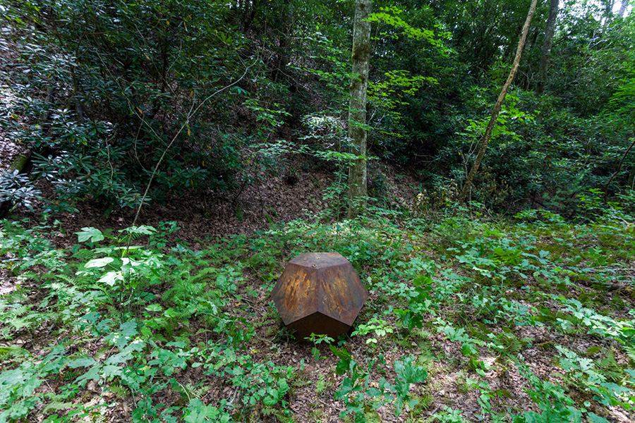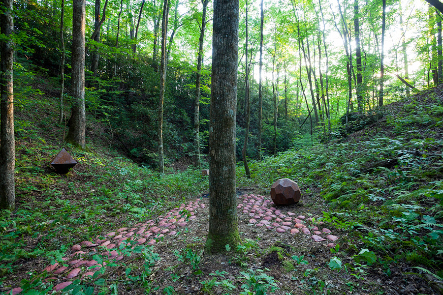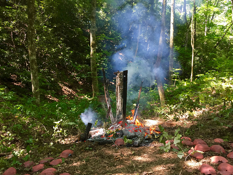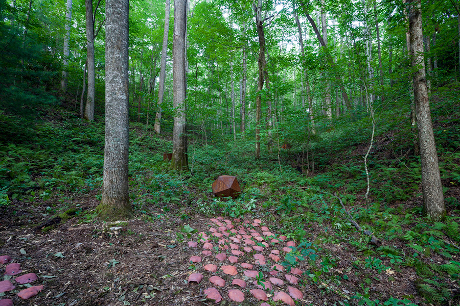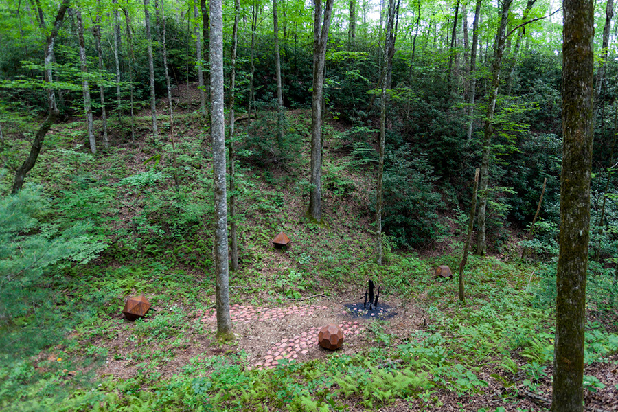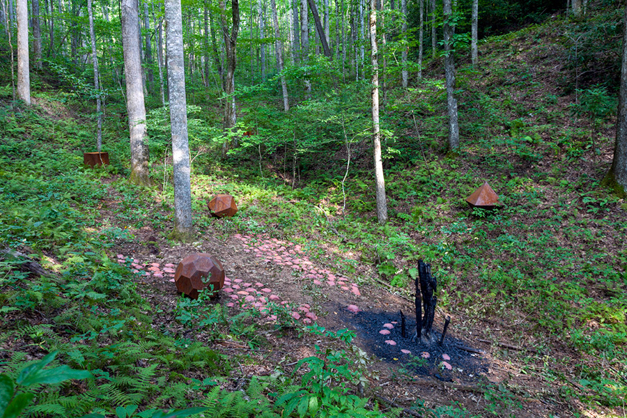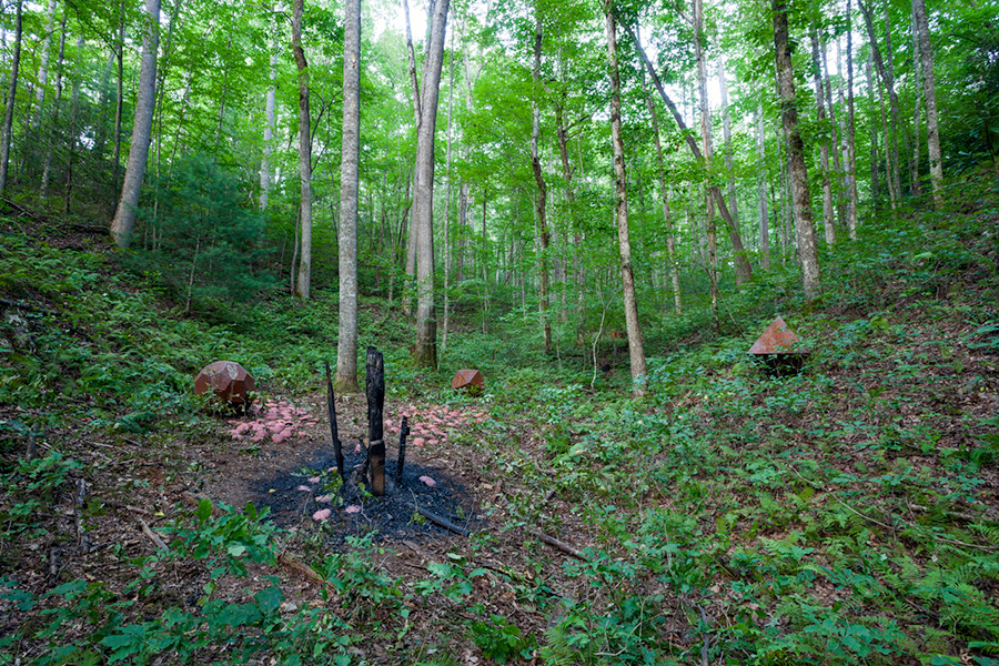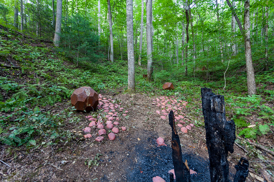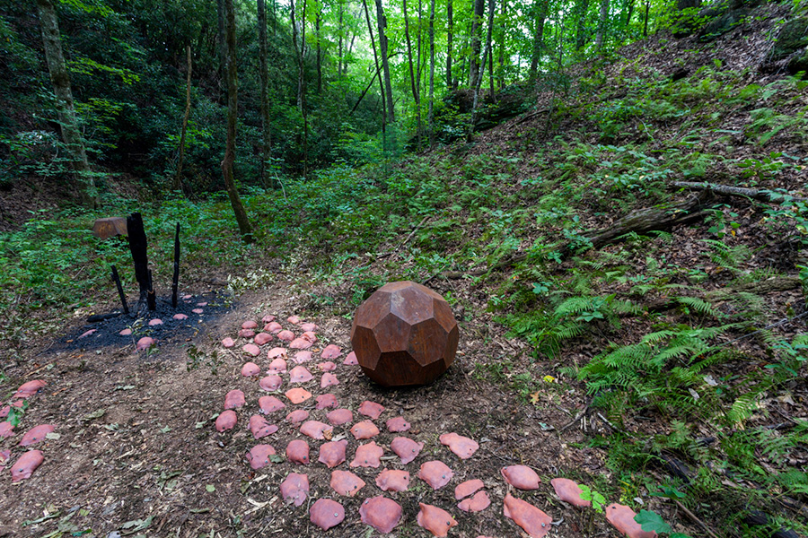MASSA CONFUSA is a site-specific installation and permanent sculpture created at the Hambidge Center for Creative Arts & Sciences, in the foothills of the North Georgia mountains. Commissioned by Dashboard US, the project was completed over the course of 5 weeks between June and August 2017, and opened under the direct path of the total solar eclipse. Based on ideas of chaos, prima materia, alchemical transformation, sacred geometry, creation mythologies, cosmogonies, numerologies, red clay, iron oxide, historical and ancient histories of Hambidge and the Blue Ridge Mountains, Cherokee and Mississippian cultures, The Secret of the Golden Flower, Jungian interpretations, ceremonial and archaeological sites, obscure objects of worship, and the varied symbolism of the terrapin, the installation incorporates the 5 Platonic Solids (tetrahedron, cube, octahedron, dodecahedron, icosahedron), 1 Archimedean Solid (truncated icosahedron, the Buckyball), approximately 200 terra-cotta artifacts, and 1 burnt offering of the primordial egg (the Massa Confusa), to create a mystical sacred space in a fern-covered ravine within the temperate Appalachian rain forest of Rabun County, Georgia.