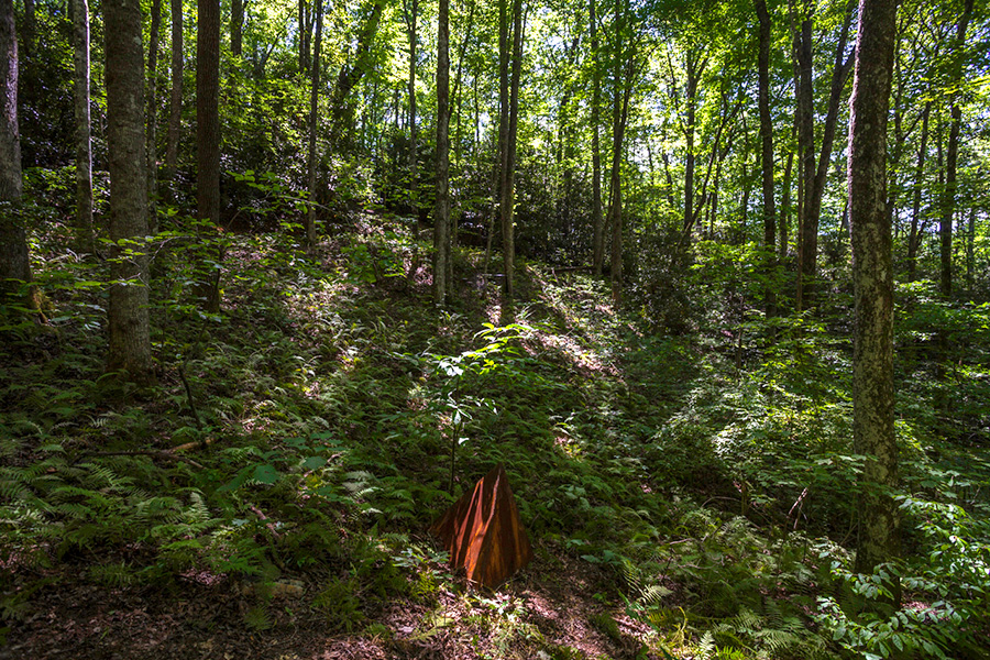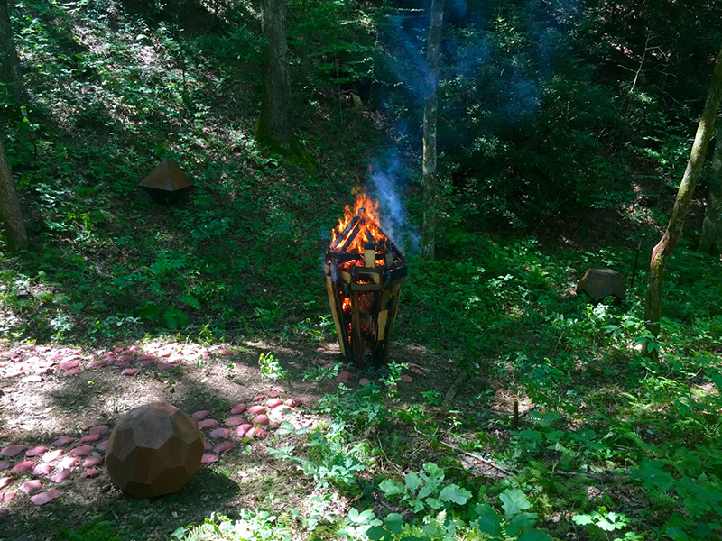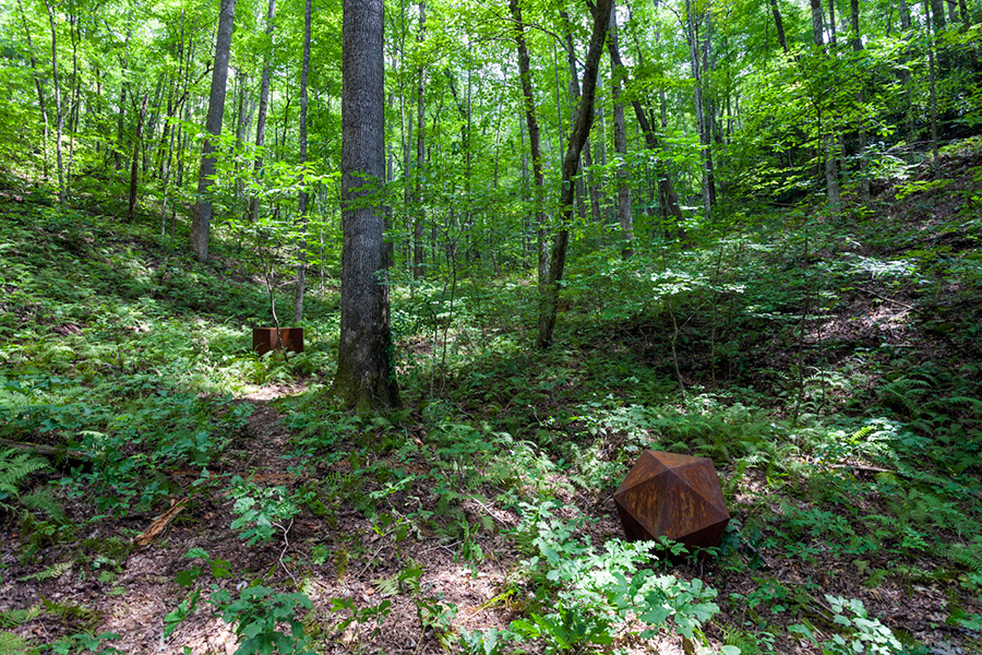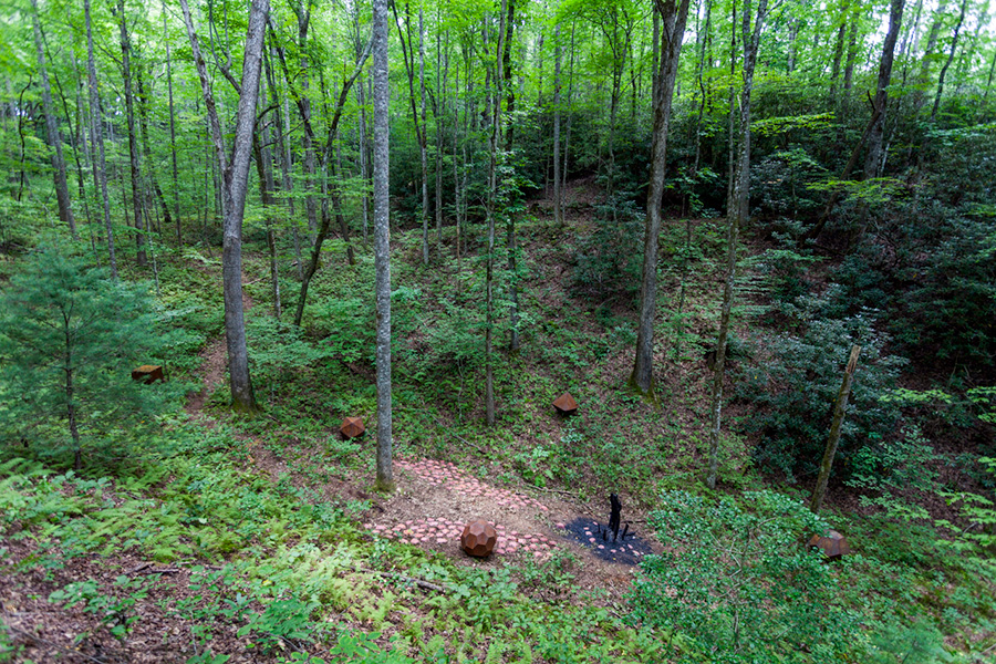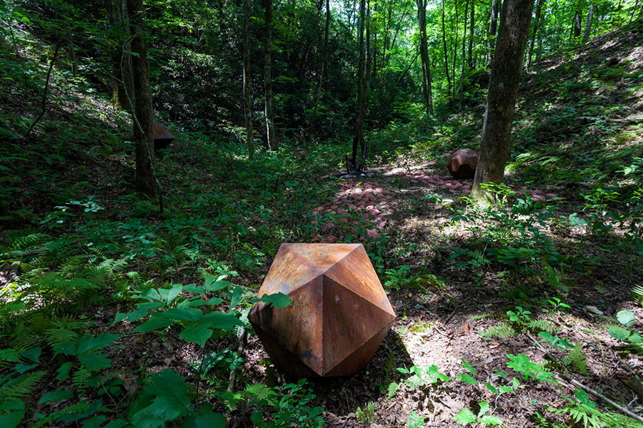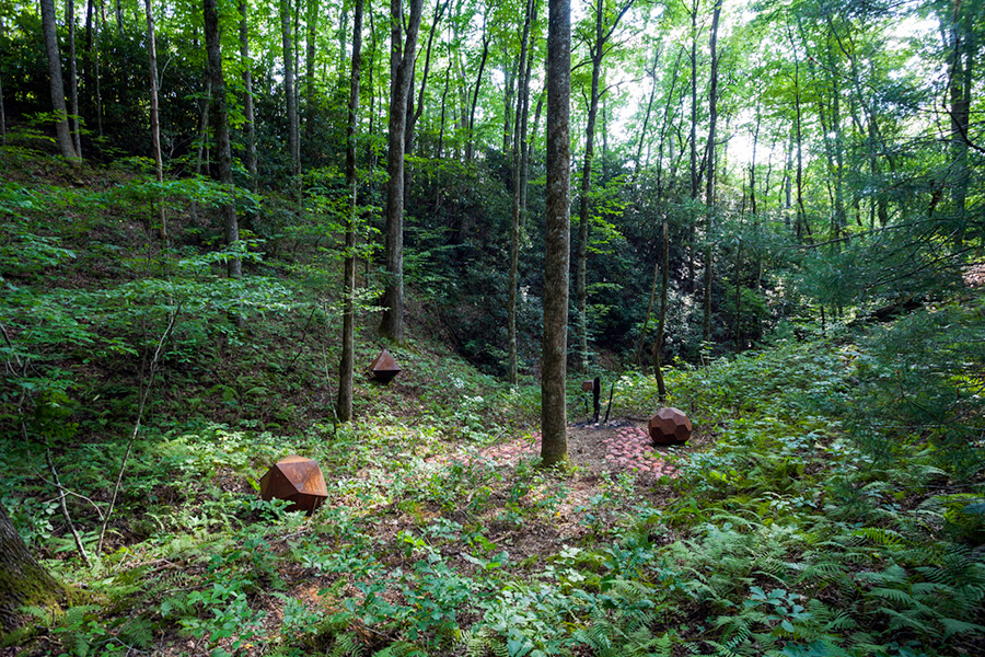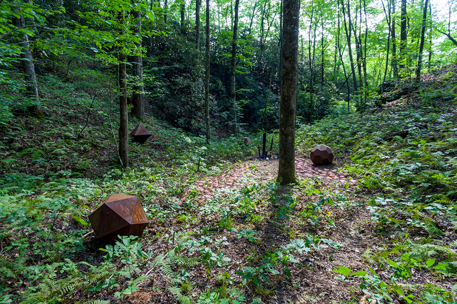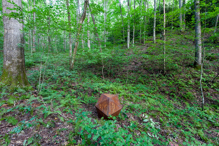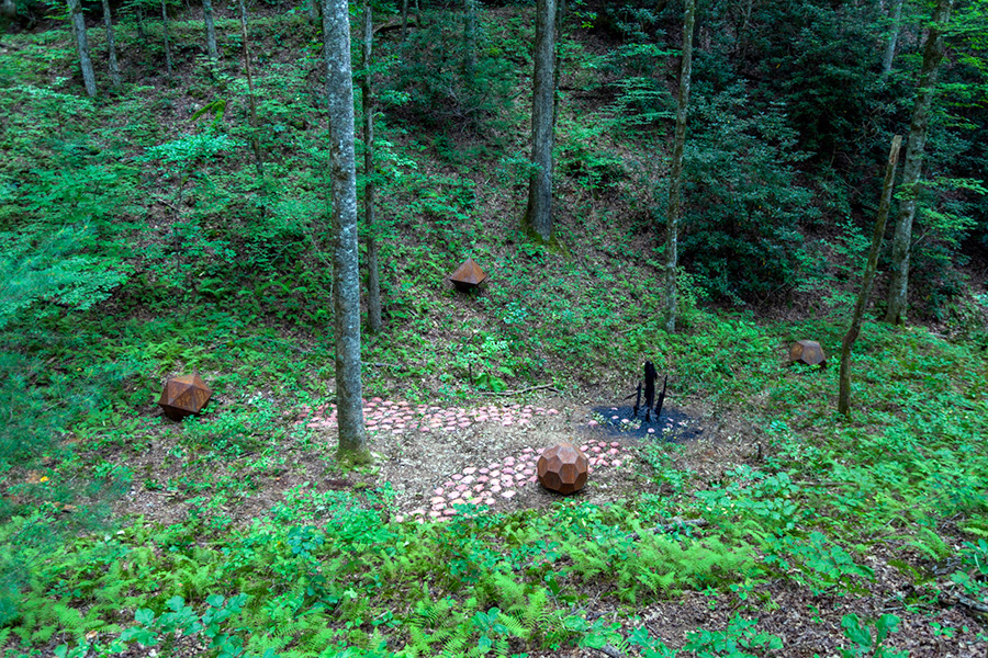 MASSA CONFUSA is a site-specific installation and permanent sculpture created at the Hambidge Center for Creative Arts & Sciences, in the foothills of the North Georgia mountains. Commissioned by Dashboard US, the project was completed over the course of 5 weeks between June and August 2017, and opened under the direct path of the total solar eclipse. Based on ideas of chaos, prima materia, alchemical transformation, sacred geometry, creation mythologies, cosmogonies, numerologies, red clay, iron oxide, historical and ancient histories of Hambidge and the Blue Ridge Mountains, Cherokee and Mississippian cultures, The Secret of the Golden Flower, Jungian interpretations, ceremonial and archaeological sites, obscure objects of worship, and the varied symbolism of the terrapin, the installation incorporates the 5 Platonic Solids (tetrahedron, cube, octahedron, dodecahedron, icosahedron), 1 Archimedean Solid (truncated icosahedron, the Buckyball), approximately 200 terra-cotta artifacts, and 1 burnt offering of the primordial egg (the Massa Confusa), to create a mystical sacred space in a fern-covered ravine within the temperate Appalachian rain forest of Rabun County, Georgia.