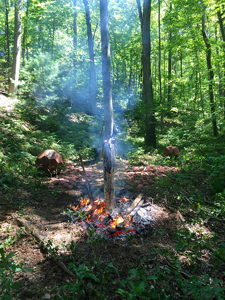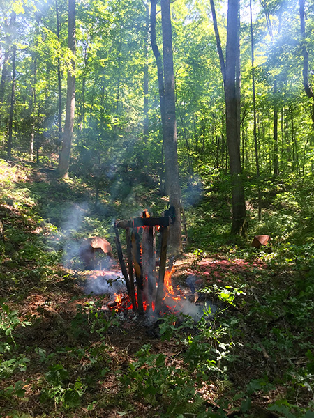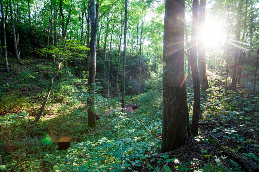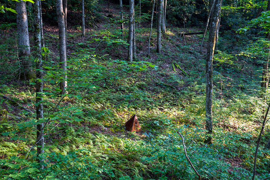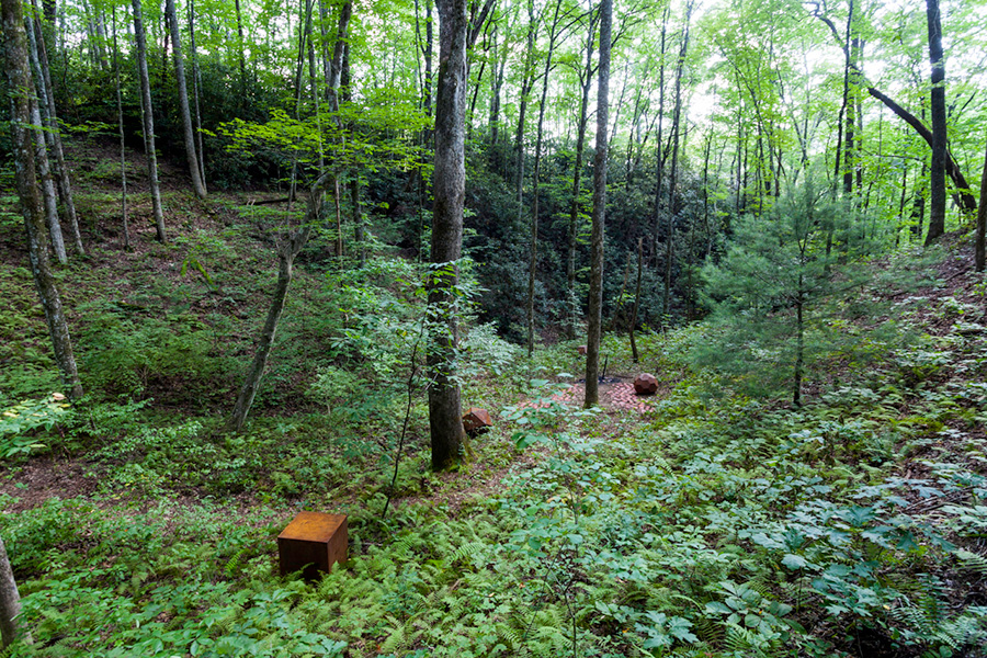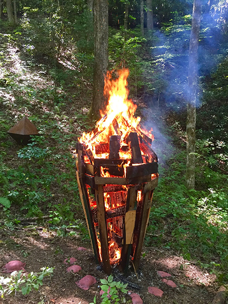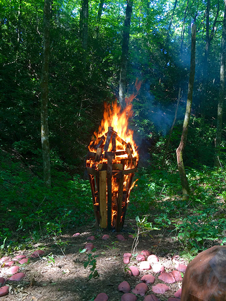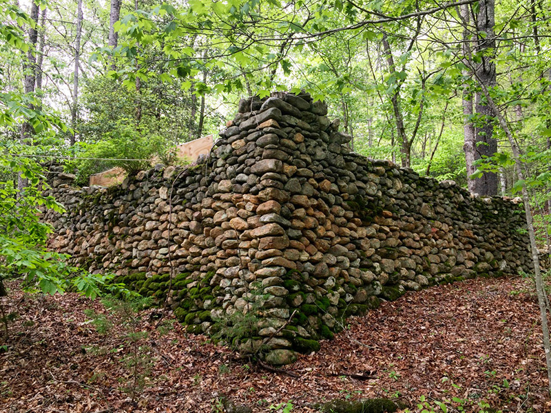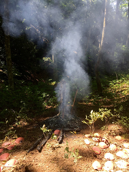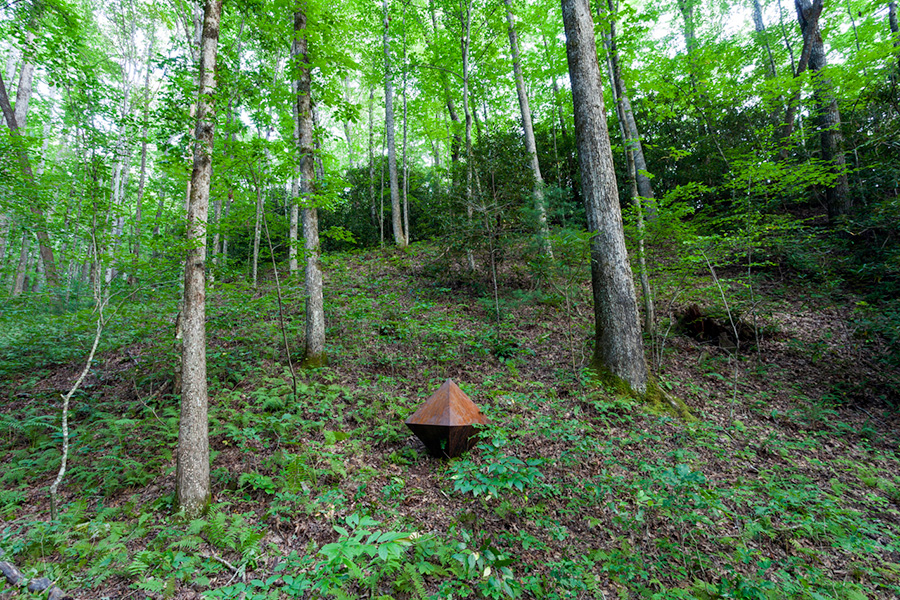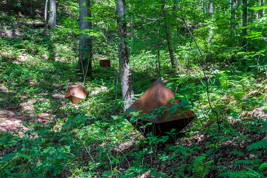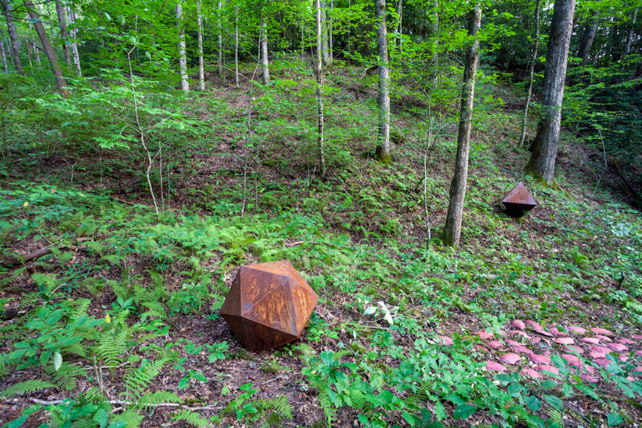MASSA CONFUSA is a site-specific installation and permanent sculpture created at the Hambidge Center for Creative Arts & Sciences, in the foothills of the North Georgia mountains. Commissioned by Dashboard US, the project was completed over the course of 5 weeks between June and August 2017, and opened under the direct path of the total solar eclipse. Based on ideas of chaos, prima materia, alchemical transformation, sacred geometry, creation mythologies, cosmogonies, numerologies, red clay, iron oxide, historical and ancient histories of Hambidge and the Blue Ridge Mountains, Cherokee and Mississippian cultures, The Secret of the Golden Flower, Jungian interpretations, ceremonial and archaeological sites, obscure objects of worship, and the varied symbolism of the terrapin, the installation incorporates the 5 Platonic Solids (tetrahedron, cube, octahedron, dodecahedron, icosahedron), 1 Archimedean Solid (truncated icosahedron, the Buckyball), approximately 200 terra-cotta artifacts, and 1 burnt offering of the primordial egg (the Massa Confusa), to create a mystical sacred space in a fern-covered ravine within the temperate Appalachian rain forest of Rabun County, Georgia.