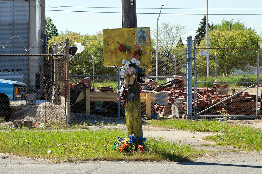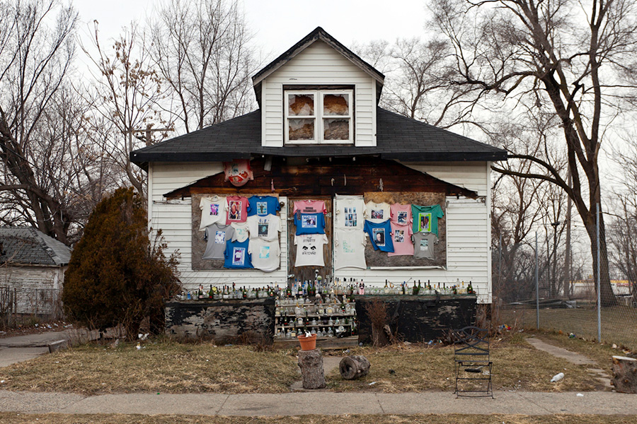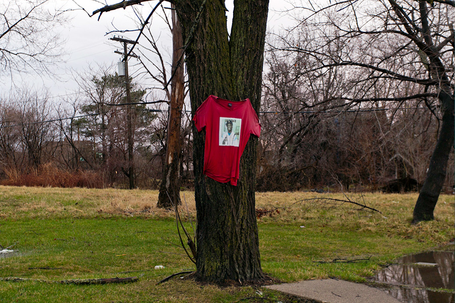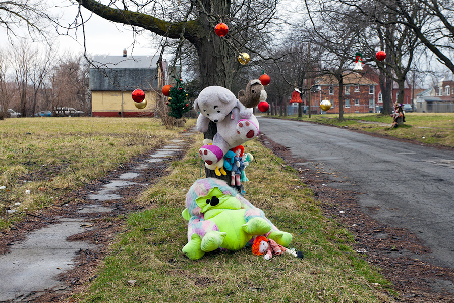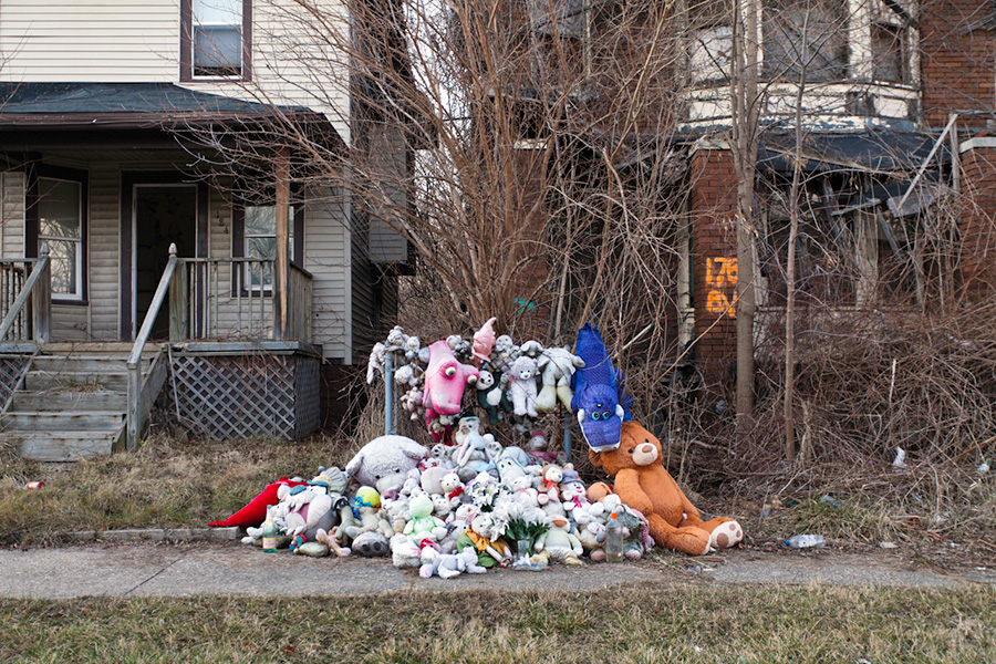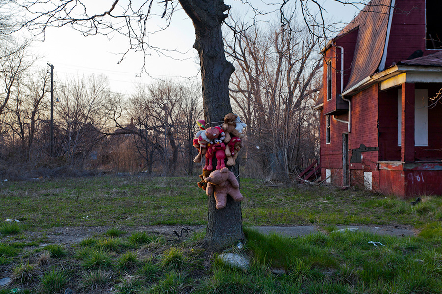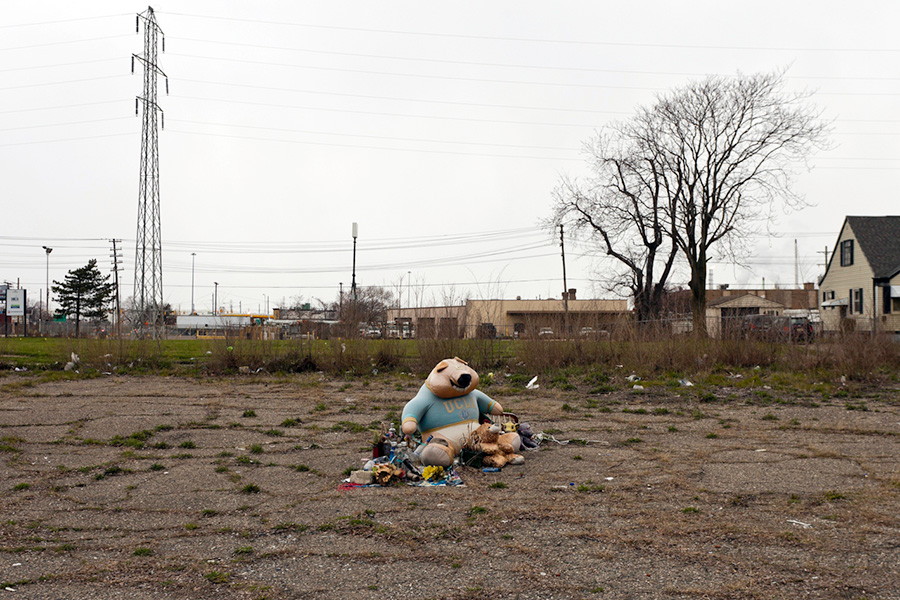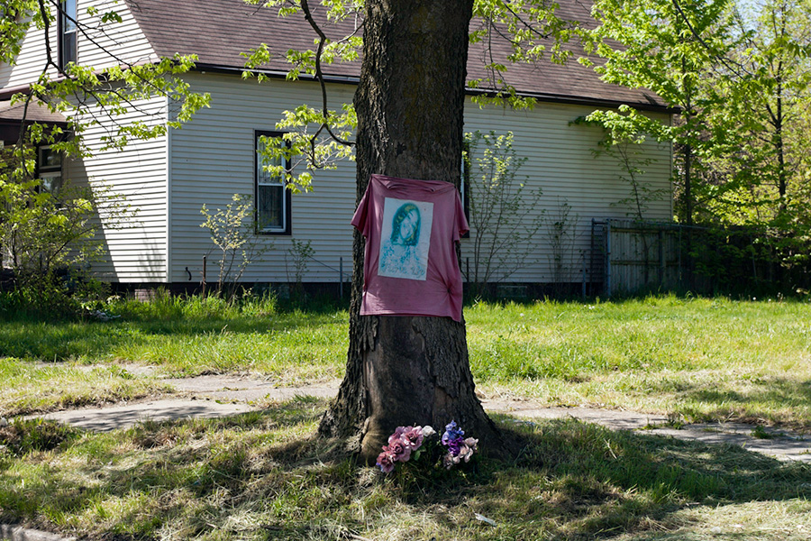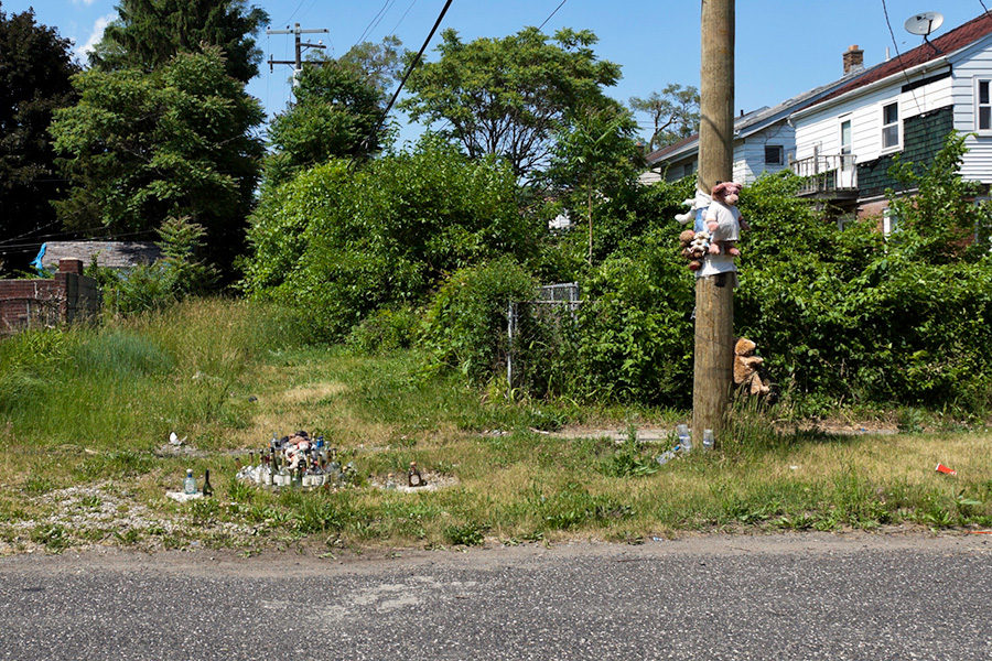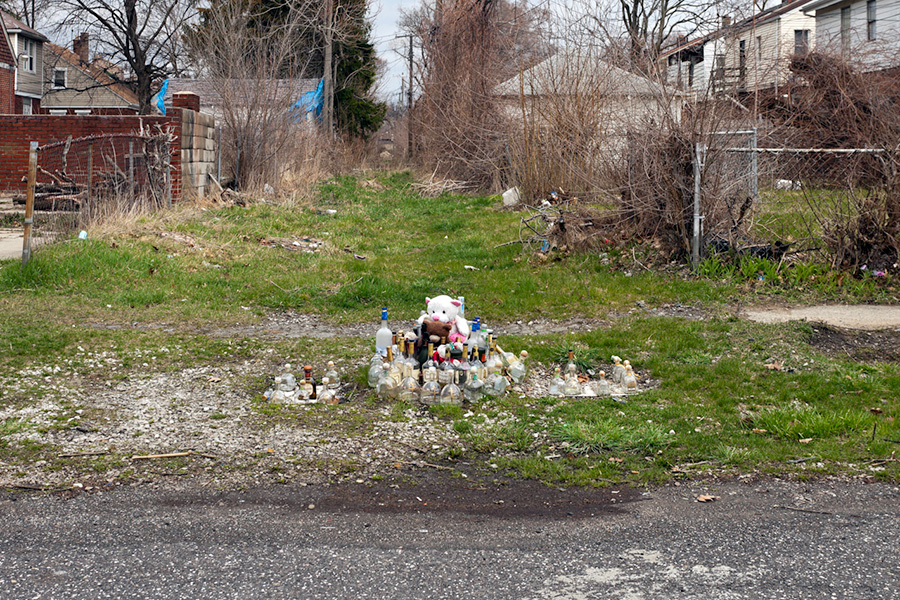 MEMORIALS is an ongoing photo series documenting the unique custom of leaving objects to commemorate where loved ones died or were killed throughout Detroit. Often memorialized through stuffed animals, t-shirts, religious iconography, and liquor bottles drank in their honor, these memorials appear on trees, houses, and utility poles across the city - and like many things in Detroit, weather away over time. |