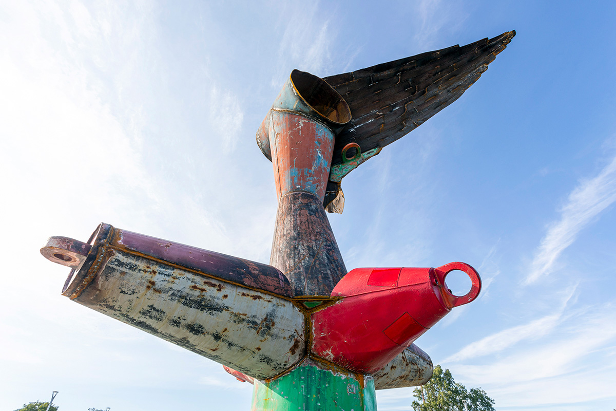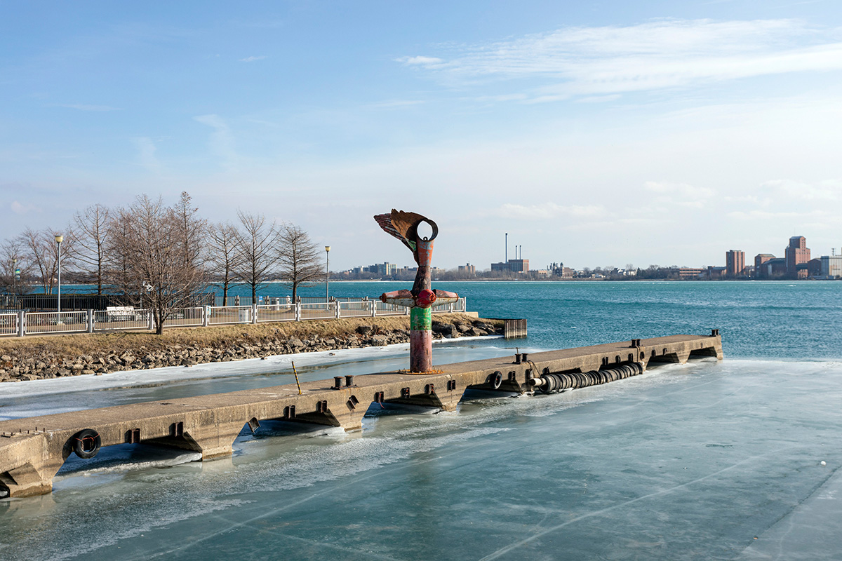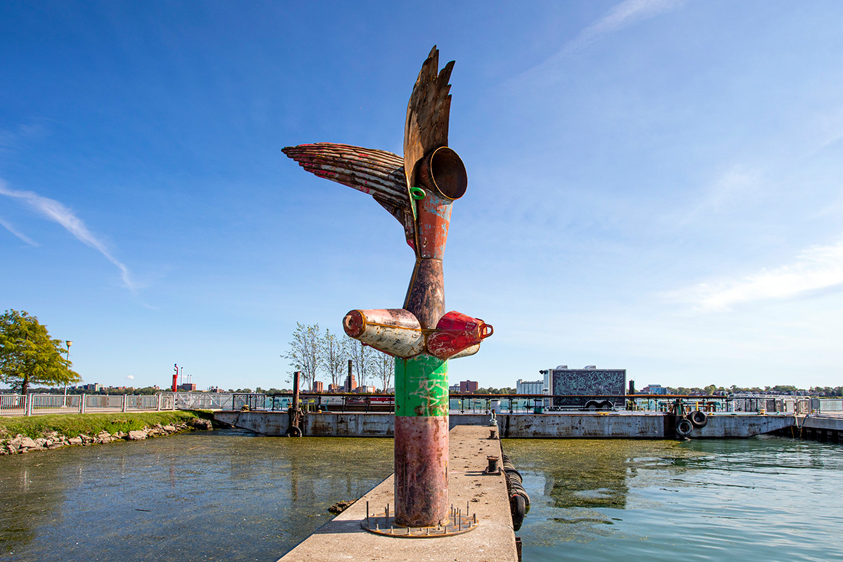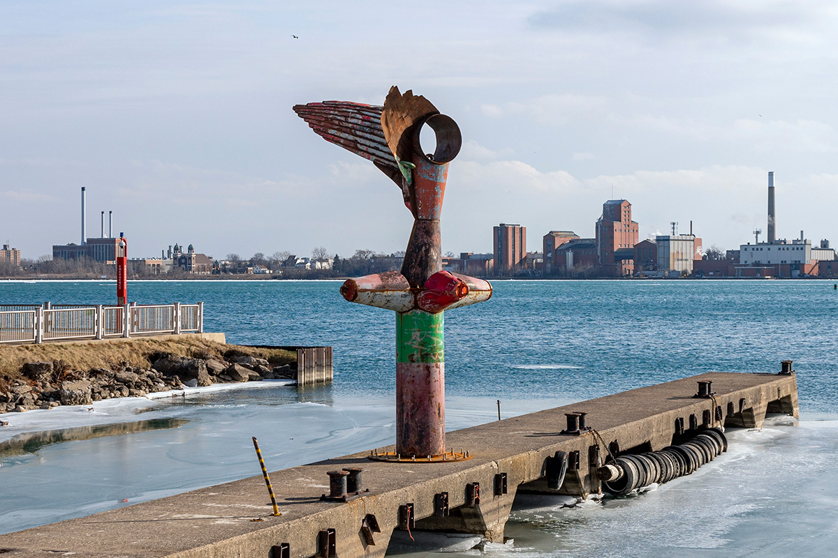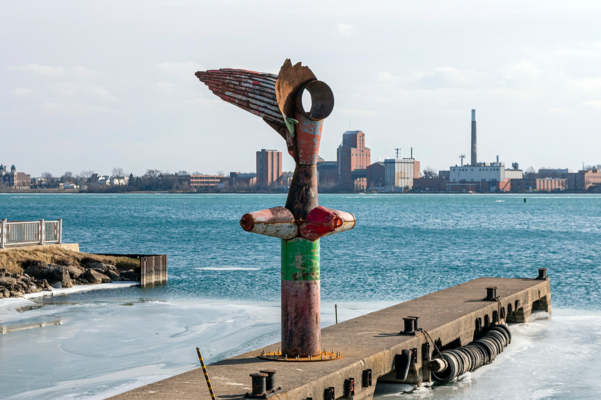 NIKE OF THE STRAIT is a site-specific sculpture commissioned by the Detroit Riverfront Conservancy and installed along the Detroit Riverwalk at Robert C. Valade Park. Created using scrap metal buoys and channel markers from the US Coast Guard, the sculpture was built throughout the COVID-19 pandemic. Conceptually, the form references the Nike of Samothrace, the winged goddess of Victory, winged figures that historically adorned ships, wooden-ribbed boat hulls, the history of Nike and Ajax missiles located along the Detroit River and Belle Isle, a former Vito Acconci concrete-boat playscape once located nearby, and the many layers of history at this site along the River. In the past, this location has been used as a USCG buoy storage yard, as John Dodge’s estate and boathouse, as a lumber and grindstone dock, and as a native river shoreline that stayed virtually unchanged for thousands of years. The sculpture is also a de-facto monument for the many birds that like to rest on this old concrete pier, hunting and swimming in the former boat slips on either side. The four buoy cones point to the four cardinal directions and the sculpture stands approximately eighteen feet tall. |