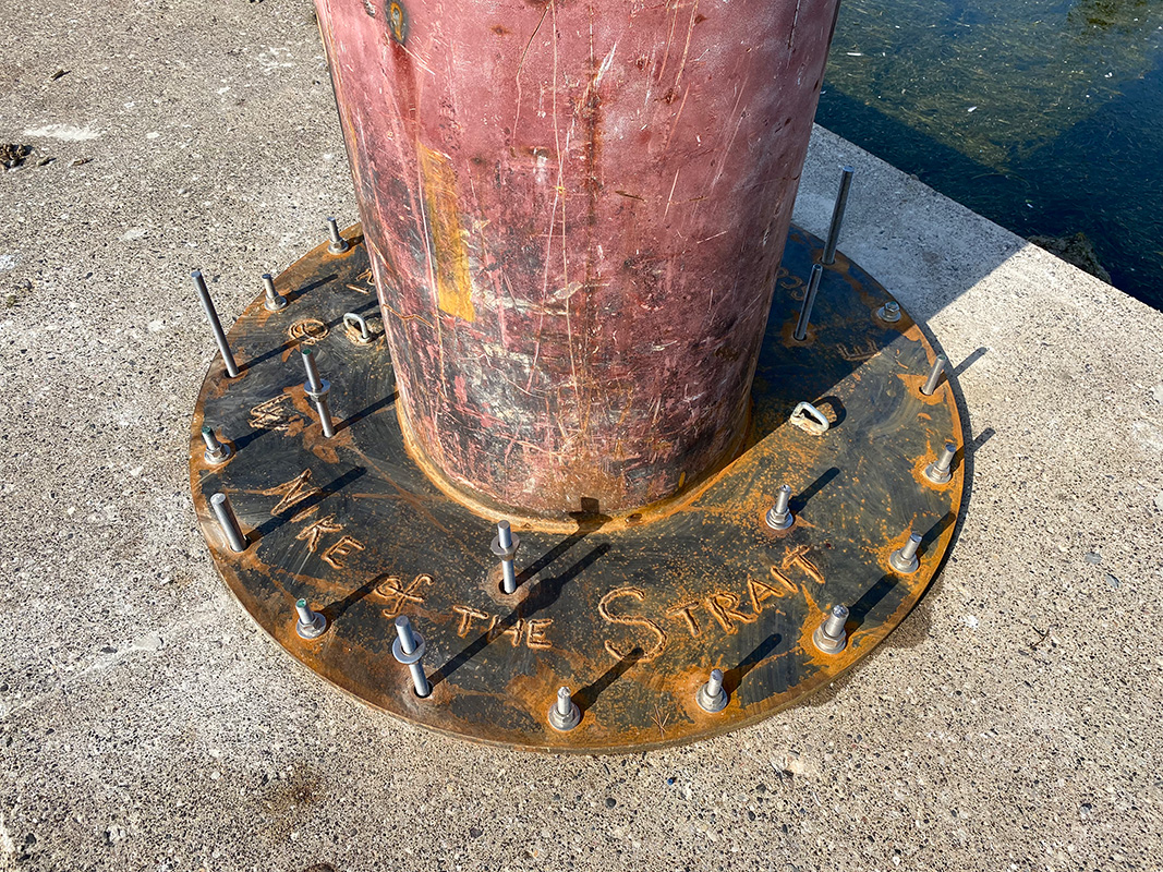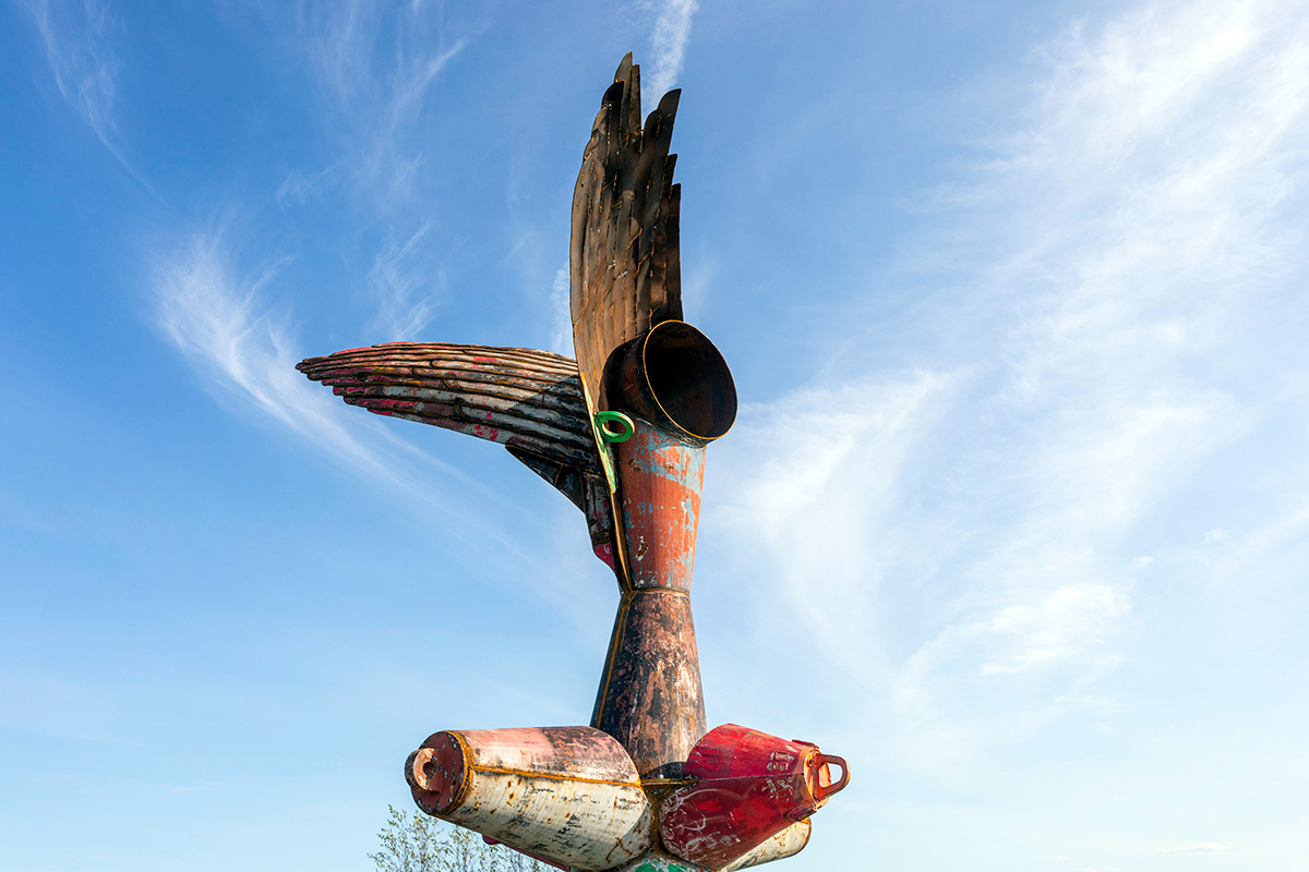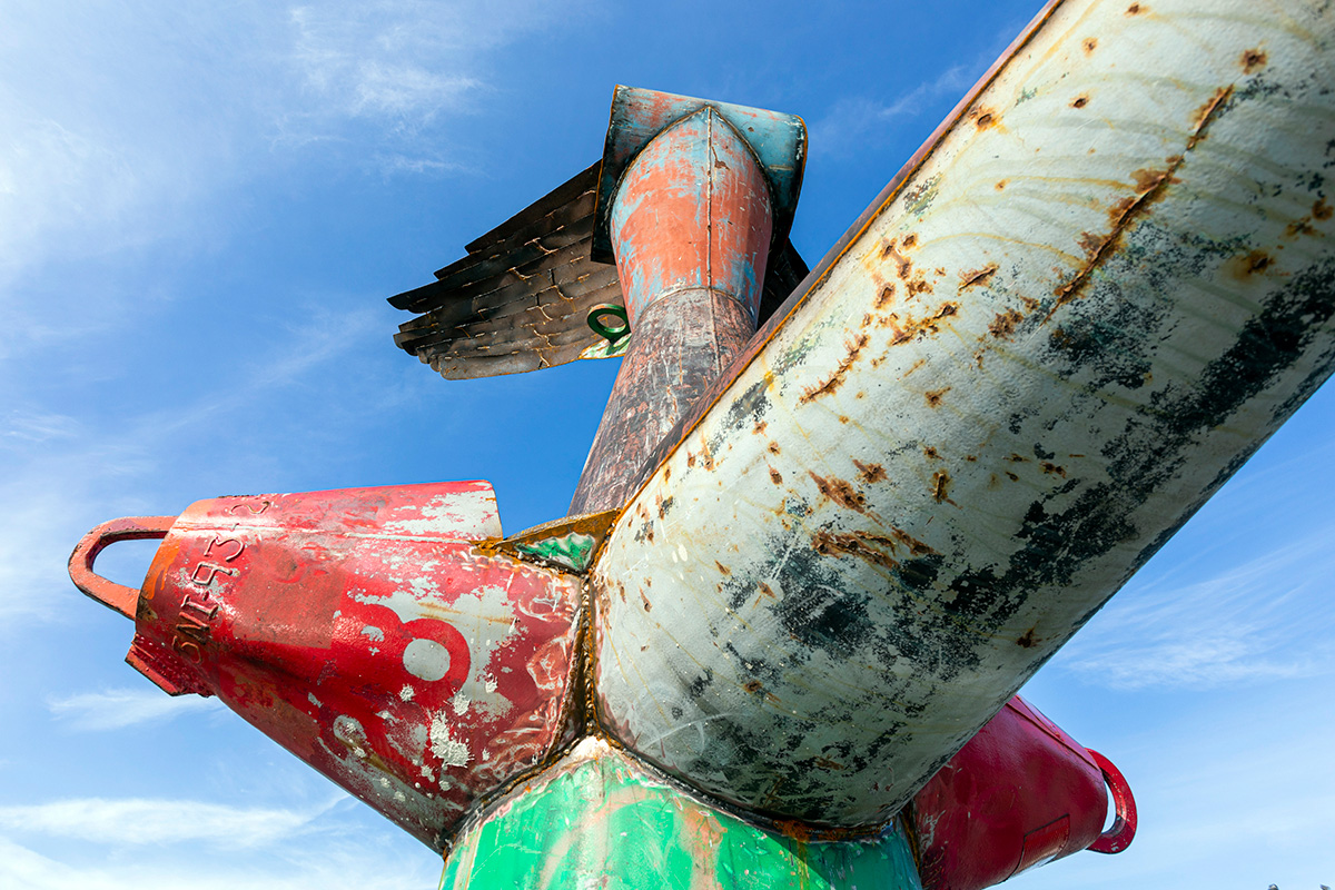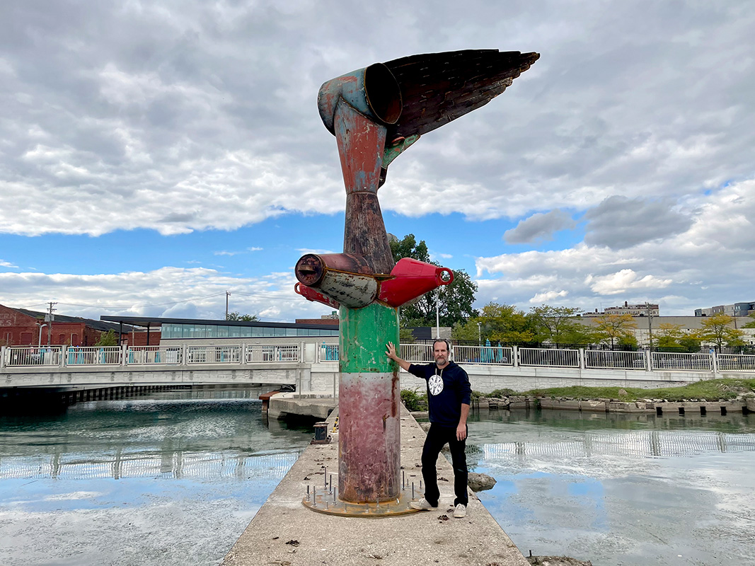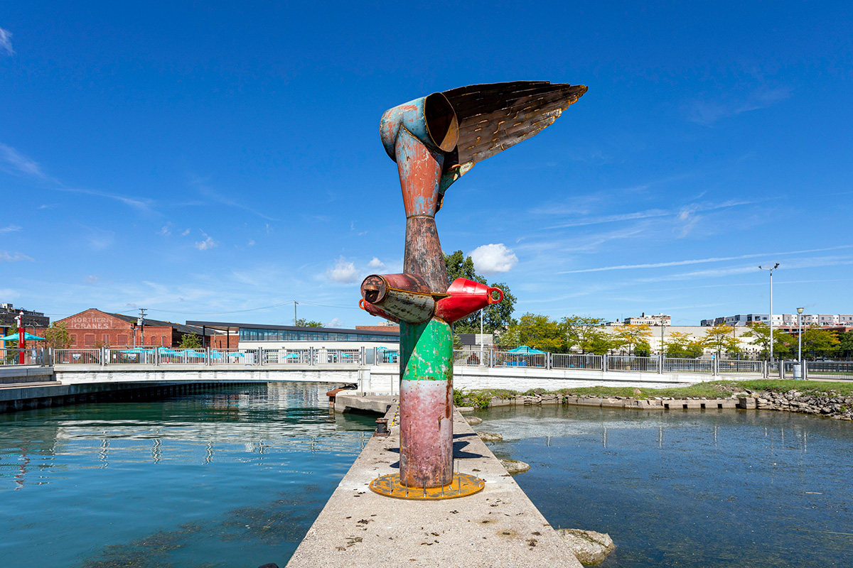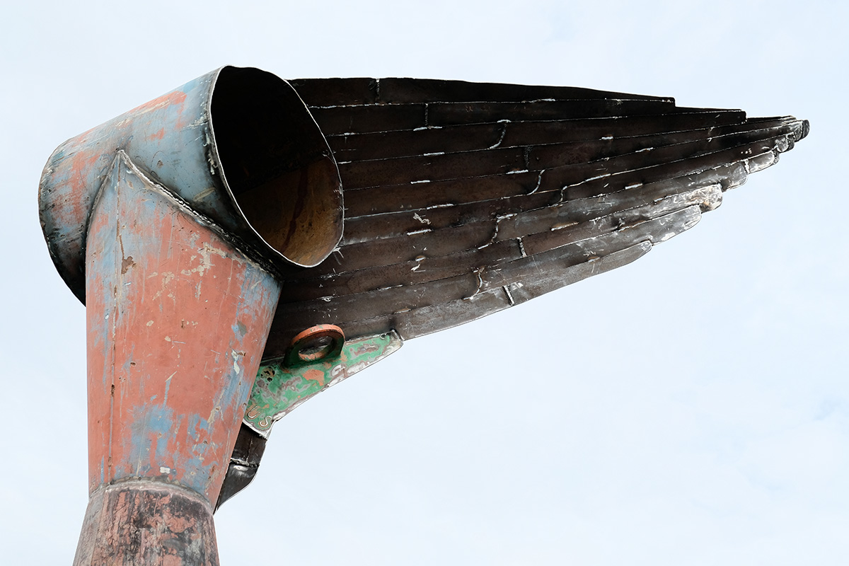 NIKE OF THE STRAIT is a site-specific sculpture commissioned by the Detroit Riverfront Conservancy and installed along the Detroit Riverwalk at Robert C. Valade Park. Created using scrap metal buoys and channel markers from the US Coast Guard, the sculpture was built throughout the COVID-19 pandemic. Conceptually, the form references the Nike of Samothrace, the winged goddess of Victory, winged figures that historically adorned ships, wooden-ribbed boat hulls, the history of Nike and Ajax missiles located along the Detroit River and Belle Isle, a former Vito Acconci concrete-boat playscape once located nearby, and the many layers of history at this site along the River. In the past, this location has been used as a USCG buoy storage yard, as John Dodge’s estate and boathouse, as a lumber and grindstone dock, and as a native river shoreline that stayed virtually unchanged for thousands of years. The sculpture is also a de-facto monument for the many birds that like to rest on this old concrete pier, hunting and swimming in the former boat slips on either side. The four buoy cones point to the four cardinal directions and the sculpture stands approximately eighteen feet tall. |