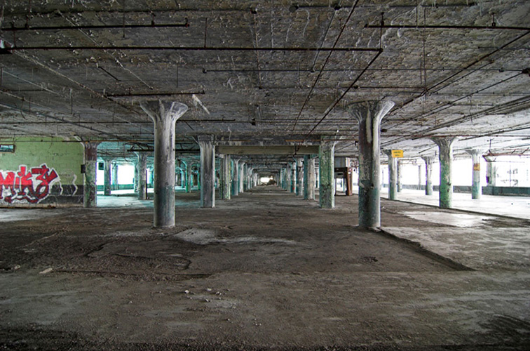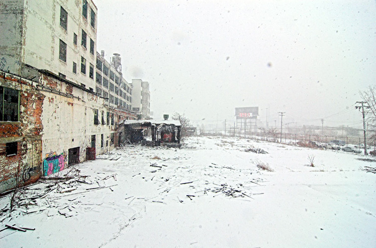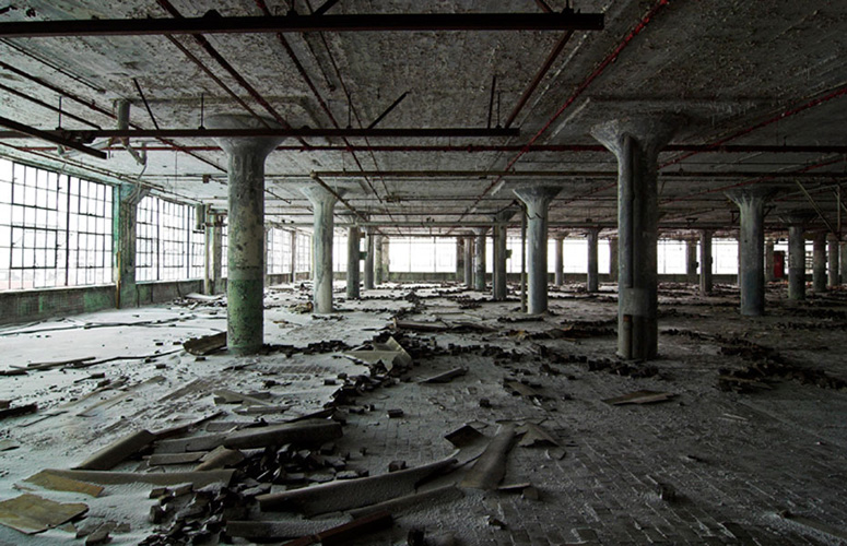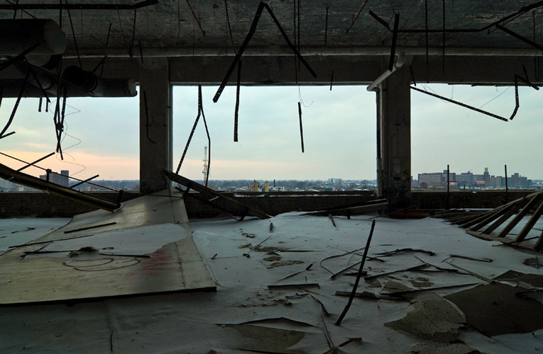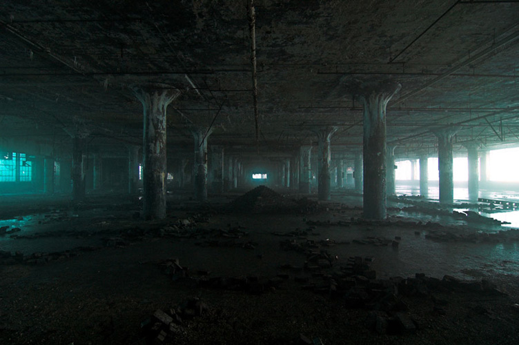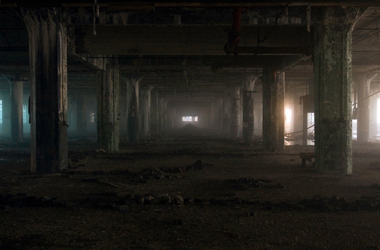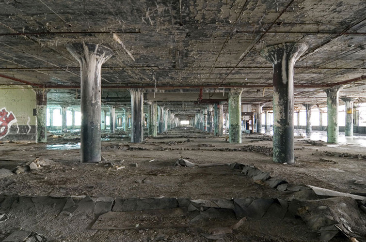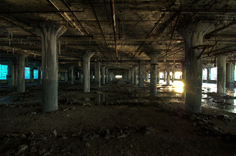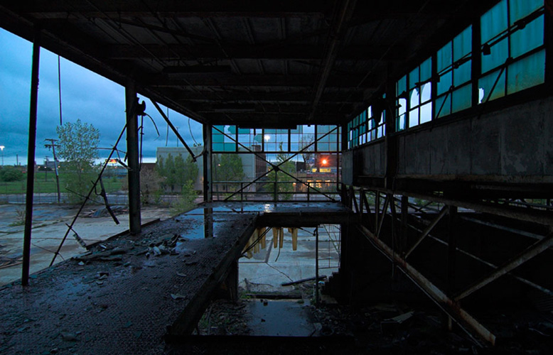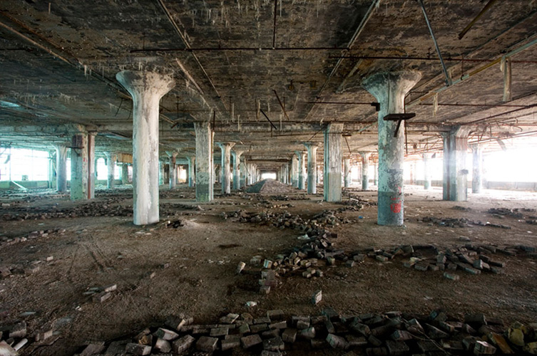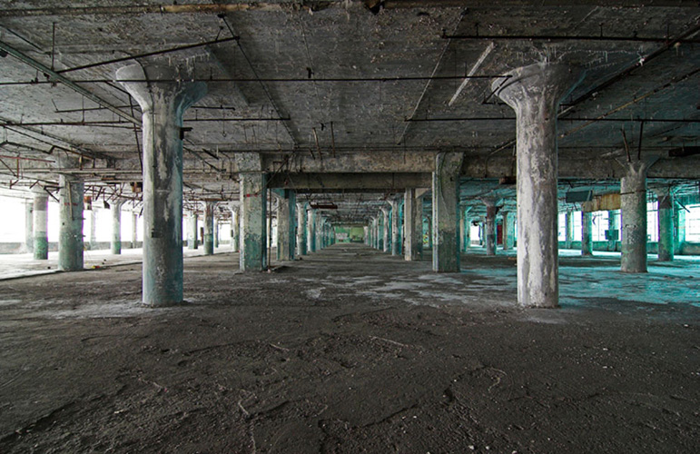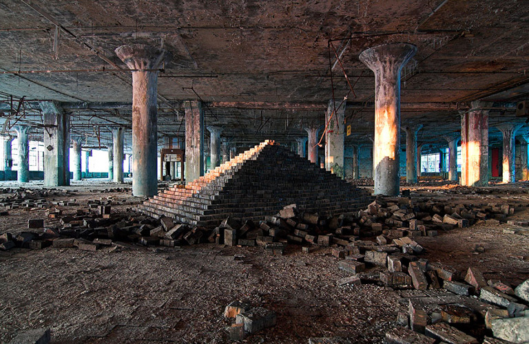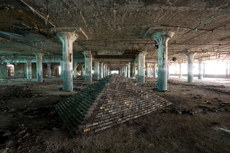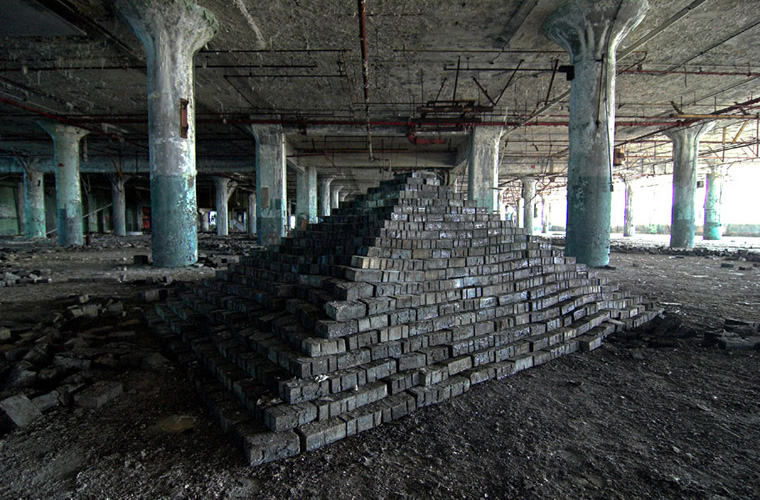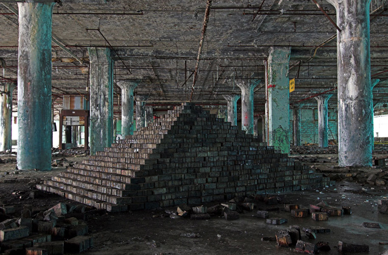 ZIGGURAT AND FB21 is a site-specific sculptural installation made from 6,201 wooden floor-blocks within Detroit’s abandoned Fisher Body Plant 21. Vacant since the early 1990s, the elements have deteriorated the 650,00-square-foot FB21, turning it into a man-made cave, with stalagmites on the floors and trees growing on the roof. The factory was stripped by scrappers, but thousands of wooden, end-grain floor blocks remained, buckled in organic patterns over years of freezing and thawing. The Ziggurat’s form was inspired by FB21’s concrete-columned architecture—its church-like lighting and mesmerizing vanishing points recalling the power of an Egyptian Hall of Kings. I wanted to ques- tion the idea of a ruin versus a monument, building a ruin within a ruin, and juxtaposing postindustrial ruination with the ancient past. It took about eight months to build, from January to August of 2008, gathering, hauling, and stacking the blocks through three seasons. By September, it was destroyed, when the Environmental Protection Agency took over and cleaned out the hazardous creosote-preserved floor blocks. Five months later, the EPA was gone, and FB21 was again reclaimed by scrappers. Since then, the site has been repeatedly boarded up and torn open, with occasional press declaring a potential renovation into a storage facility, a loft complex, or a music venue, including the latest proposal to transform the beast into an apartment and retail complex by 2025.