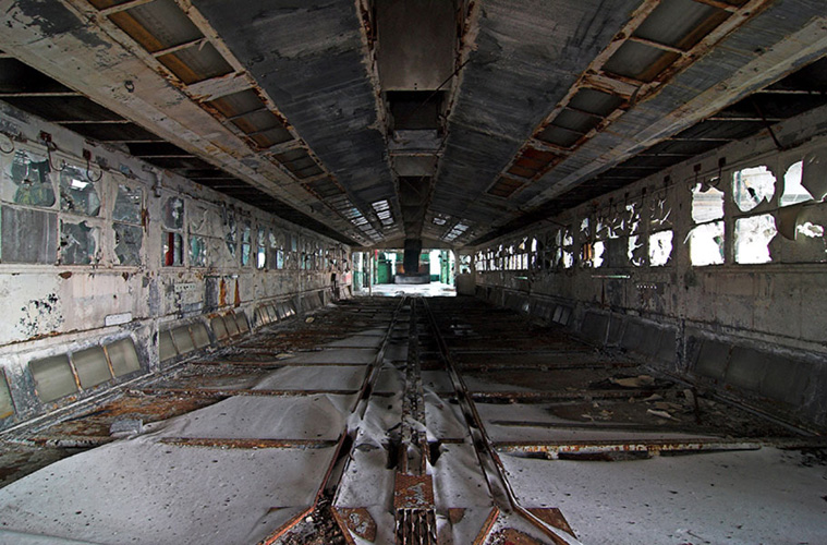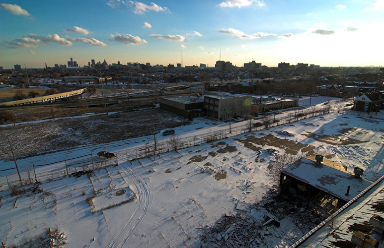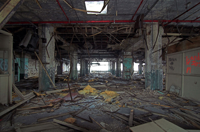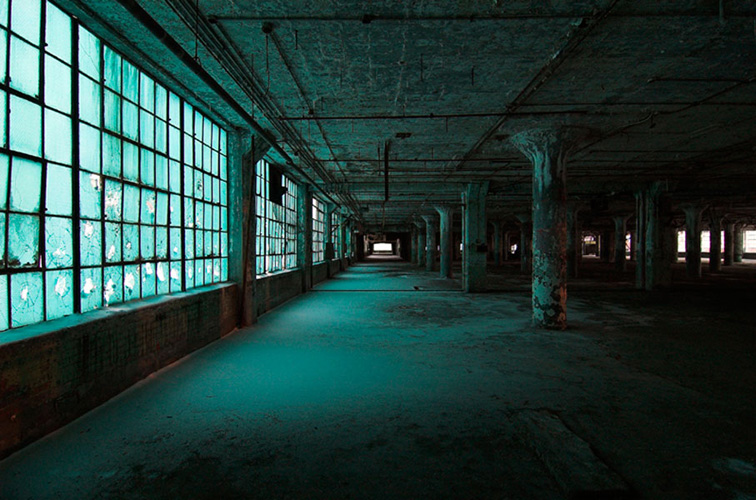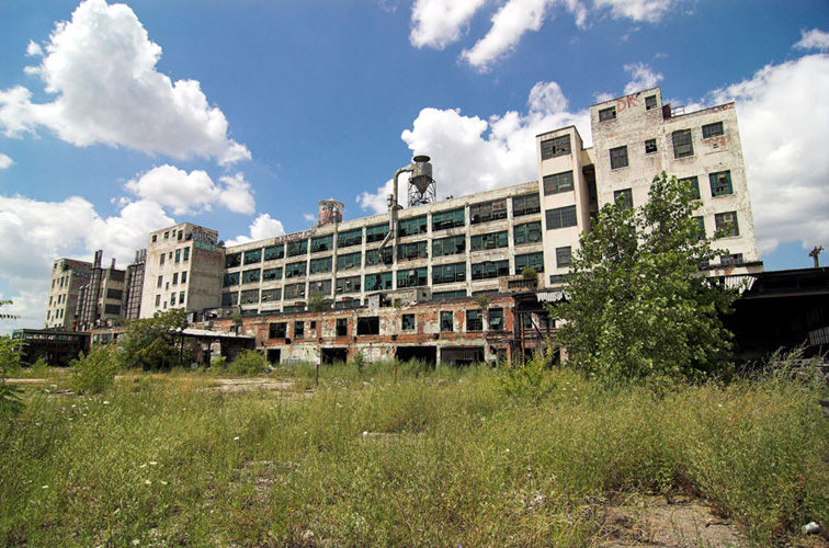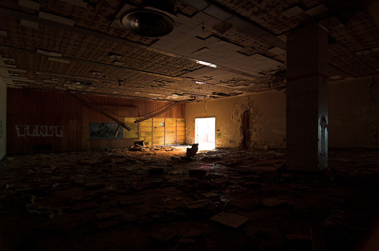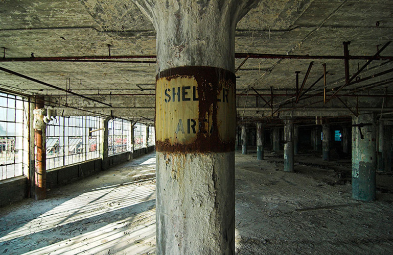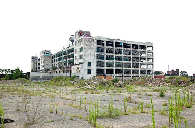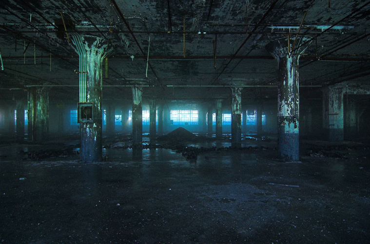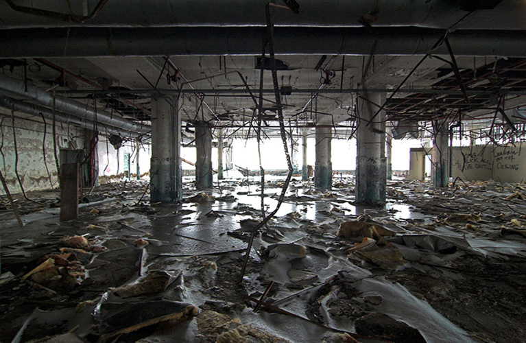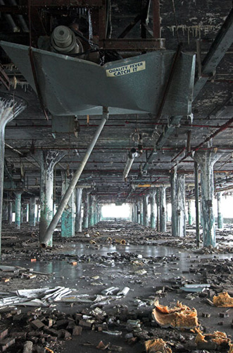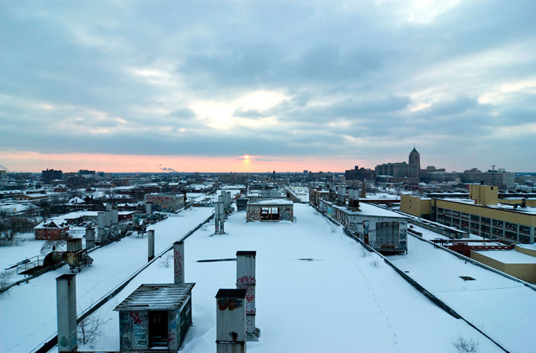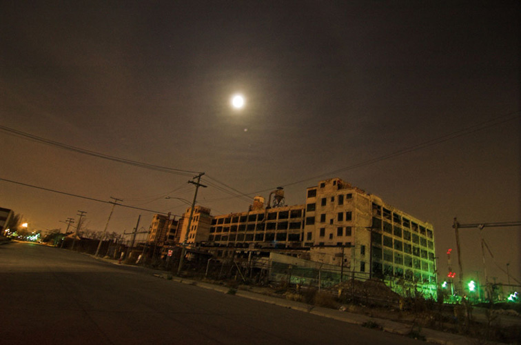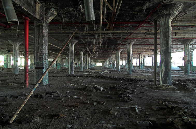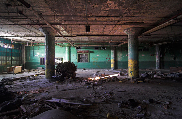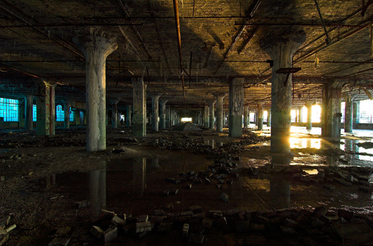ZIGGURAT AND FB21 is a site-specific sculptural installation made from 6,201 wooden floor-blocks within Detroit’s abandoned Fisher Body Plant 21. Vacant since the early 1990s, the elements have deteriorated the 650,00-square-foot FB21, turning it into a man-made cave, with stalagmites on the floors and trees growing on the roof. The factory was stripped by scrappers, but thousands of wooden, end-grain floor blocks remained, buckled in organic patterns over years of freezing and thawing. The Ziggurat’s form was inspired by FB21’s concrete-columned architecture—its church-like lighting and mesmerizing vanishing points recalling the power of an Egyptian Hall of Kings. I wanted to ques- tion the idea of a ruin versus a monument, building a ruin within a ruin, and juxtaposing postindustrial ruination with the ancient past. It took about eight months to build, from January to August of 2008, gathering, hauling, and stacking the blocks through three seasons. By September, it was destroyed, when the Environmental Protection Agency took over and cleaned out the hazardous creosote-preserved floor blocks. Five months later, the EPA was gone, and FB21 was again reclaimed by scrappers. Since then, the site has been repeatedly boarded up and torn open, with occasional press declaring a potential renovation into a storage facility, a loft complex, or a music venue, including the latest proposal to transform the beast into an apartment and retail complex by 2025.