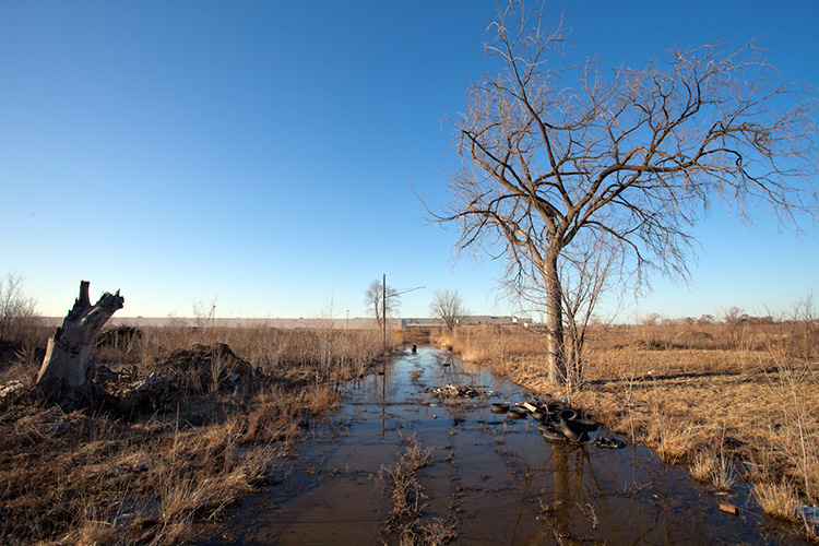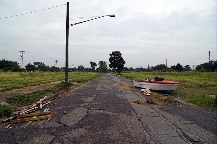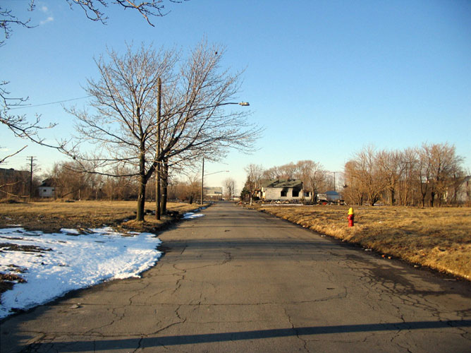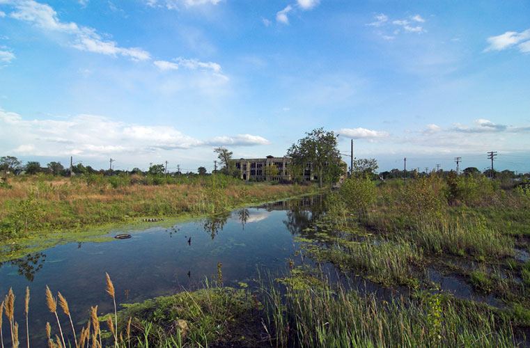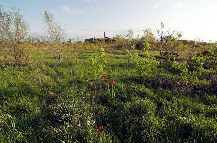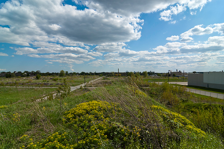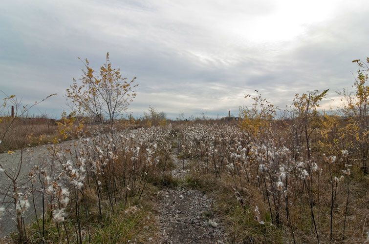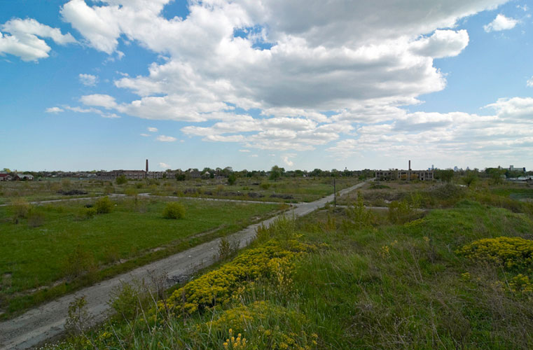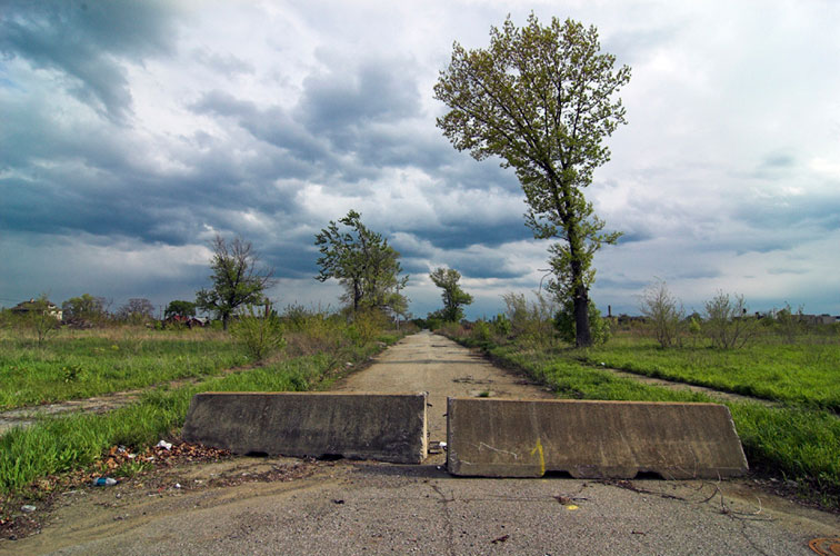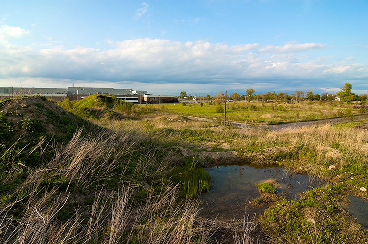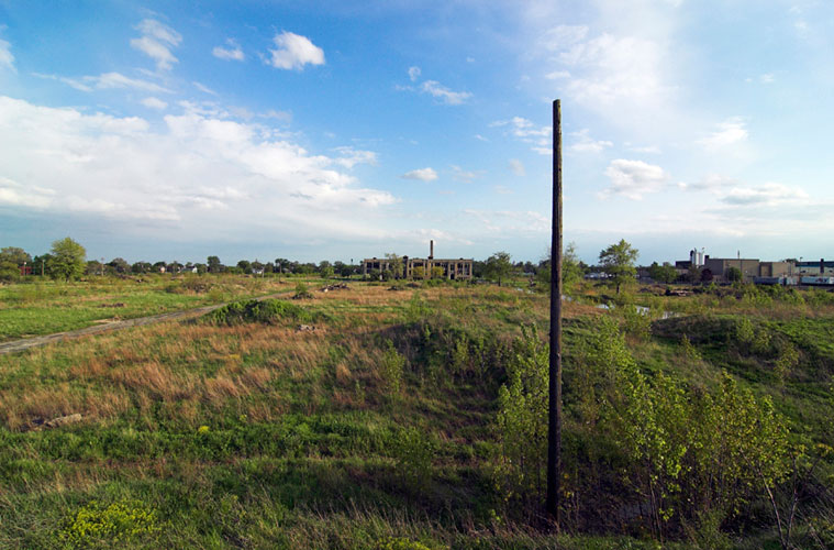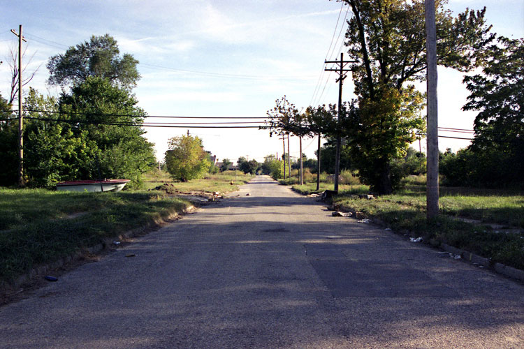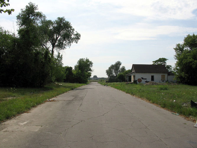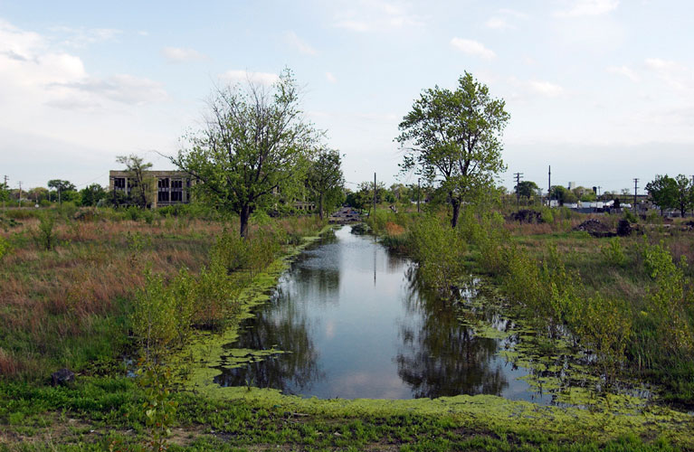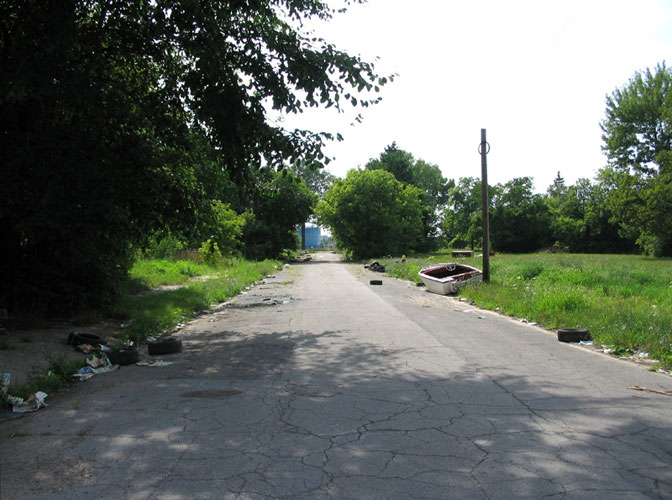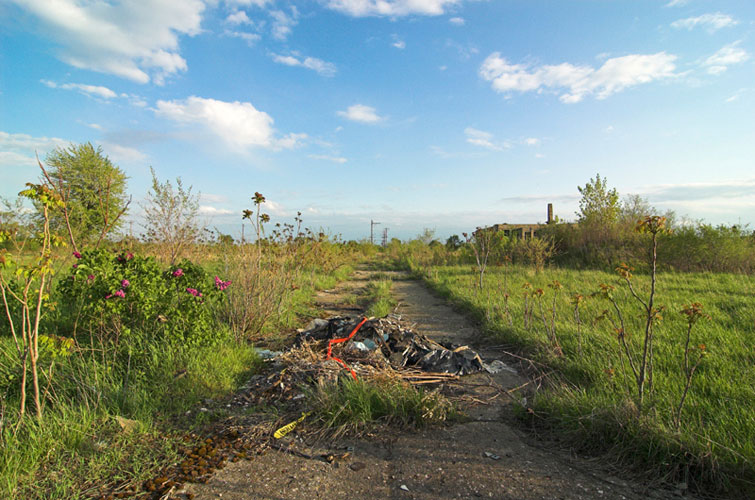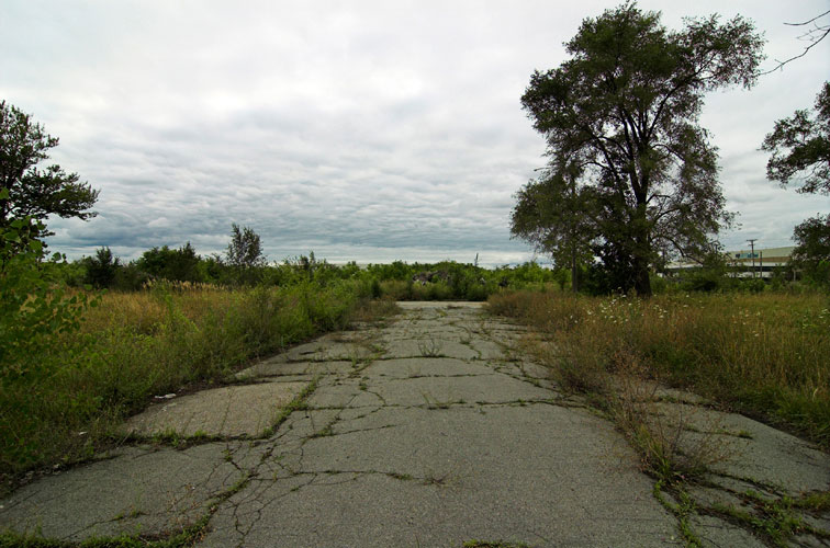 THE ZONE - Since the late 1990s, I've watched this neighborhood become abandoned, torn down, and blocked off by concrete barricades. The last residents moved out, their houses and the burnt ones surrounding them were demolished; the haunted church of St. Cyril's village was scrapped to the point of collapse; the vacant streets became dumping grounds, which brought on the concrete roadblocks; the trees were torn out, to appease potential builders; finally Cooper school on Georgia was closed and scrapped clean. But the sale of the land never happened. Aside from the massive complexes along Huber, The Zone still sits vacant. Large uprooted trees lay in piles. Random mounds of earth and demolished debris have overgrown with grasses and wildflowers. Flooded streets have become marshlands and swamps. Wildlife abounds: pheasants, rabbits, snakes, frogs, hawks, numerous birds, along with stray cats or dogs, can all be found here. The I-94 Industrial Park Renaissance Zone has inadvertently become one of the most natural topographies of Detroit.